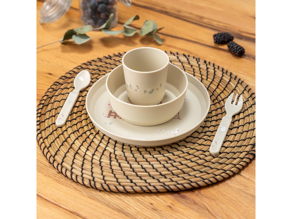Lehký talíř s vyvýšeným okrajem, mělká lžička a vidlička se širokou rukojetí jsou ideální pro malé dětské ruce.