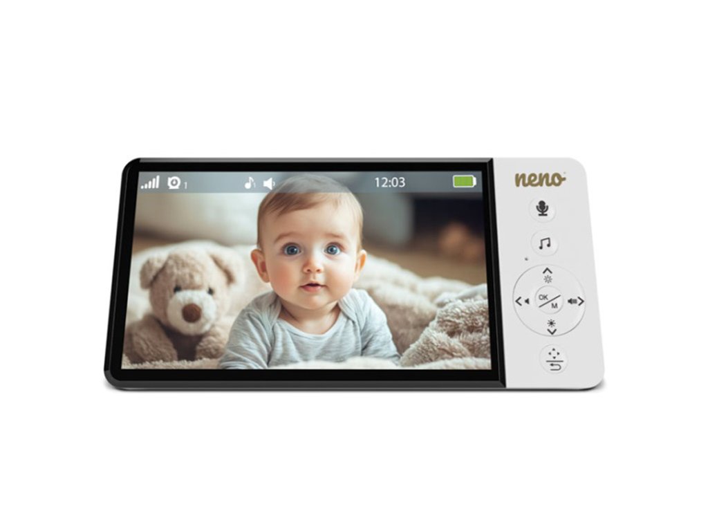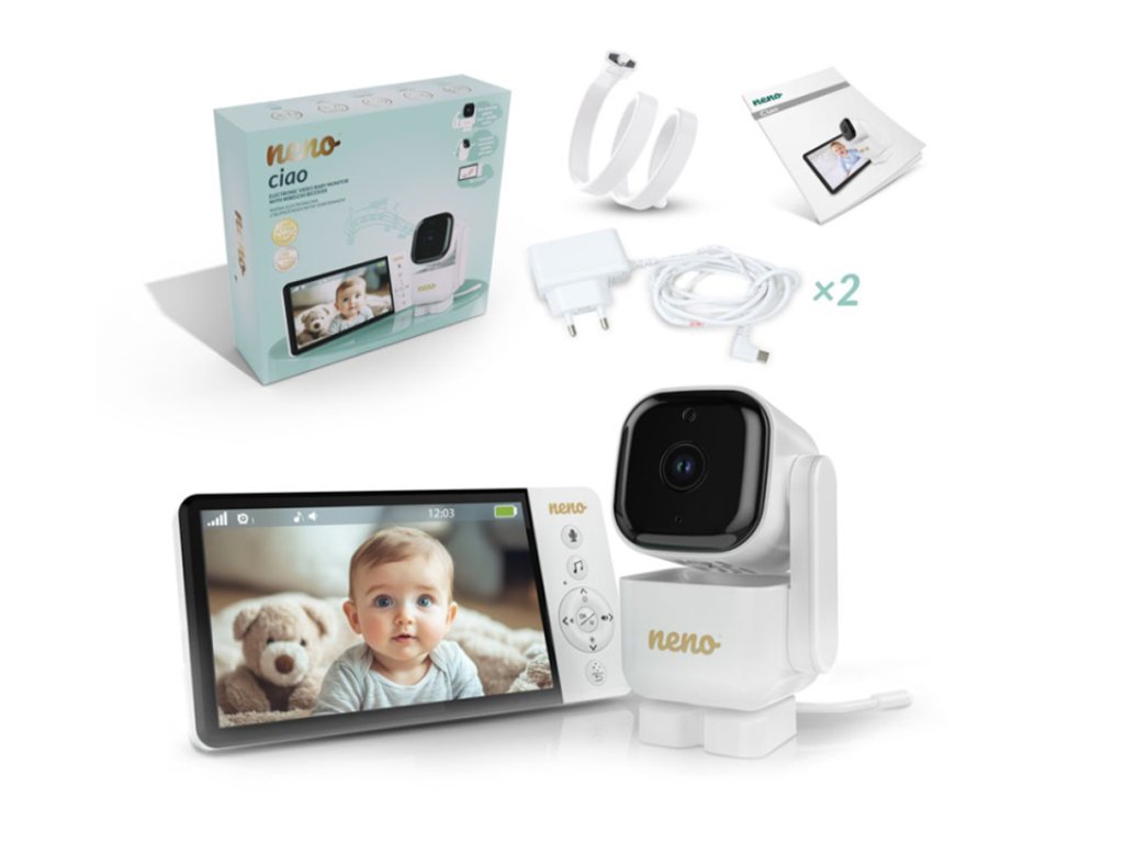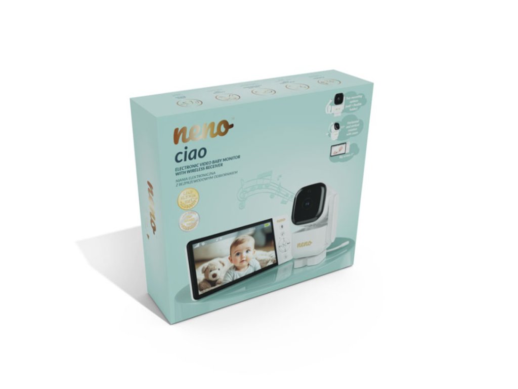 Neno Ciao je moderní elektronická videochůvička s bezdrátovým přijímačem a 5palcovým displejem. Díky otočné kameře s funkcí Pan & Tilt (355° horizontálně, 90° vertikálně) můžete sledovat celou místnost z pohodlí kdekoli. Monitor je vybaven dvousměrnou komunikací, snímačem teploty, 8 uklidňujícími ukolébavkami a nočním režimem, který podporuje péči během dne i noci. Díky VOX technologii se obrazovka zapne jen při detekci zvuku, čímž šetří energii. Silná vestavěná baterie přijímače umožňuje používání až do 12 hodin bez nabíjení. Monitor má dosah až 300 metrů na otevřeném prostranství a podporuje připojení další kamery pro rozšíření dohledu.