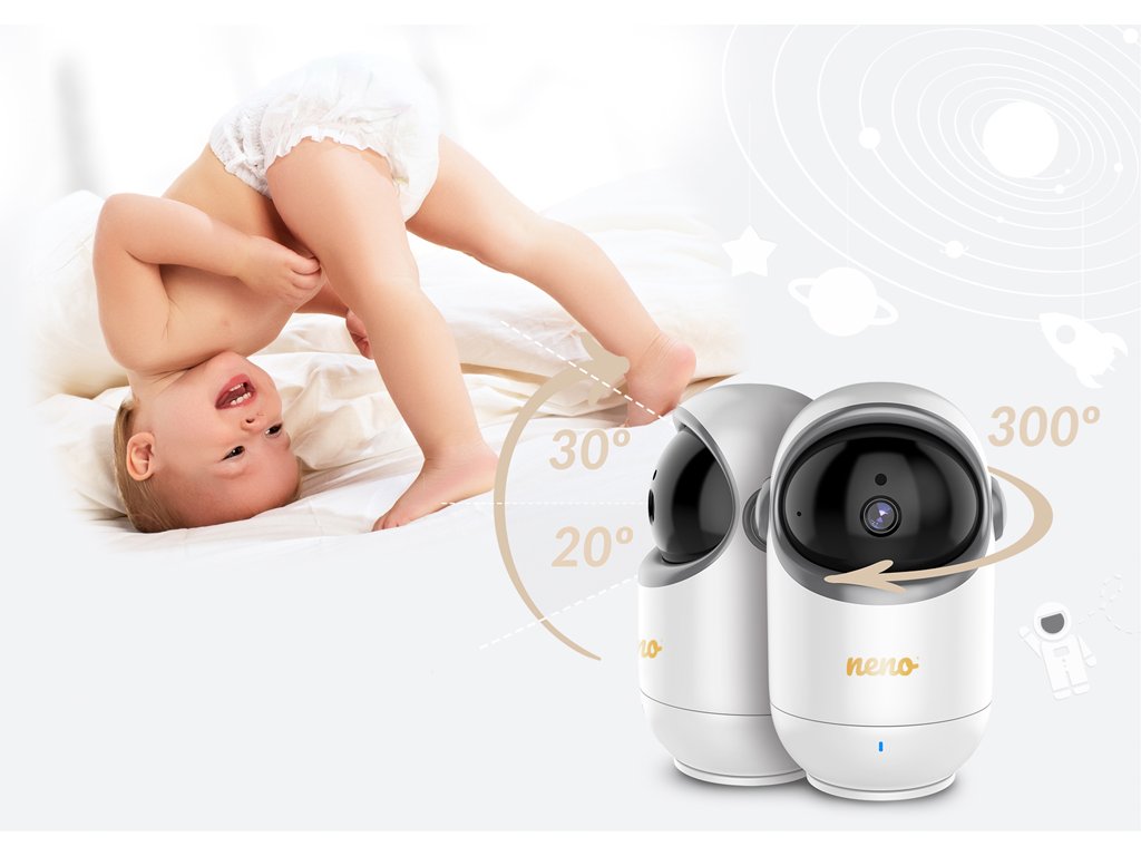 Seznamte se s moderní elektronickou video chůvičkou Neno Berkano s pohyblivou hlavou, která umožňuje horizontální pohled na dítě v rozsahu 300 stupňů a vertikální pohled v rozsahu 50 stupňů.