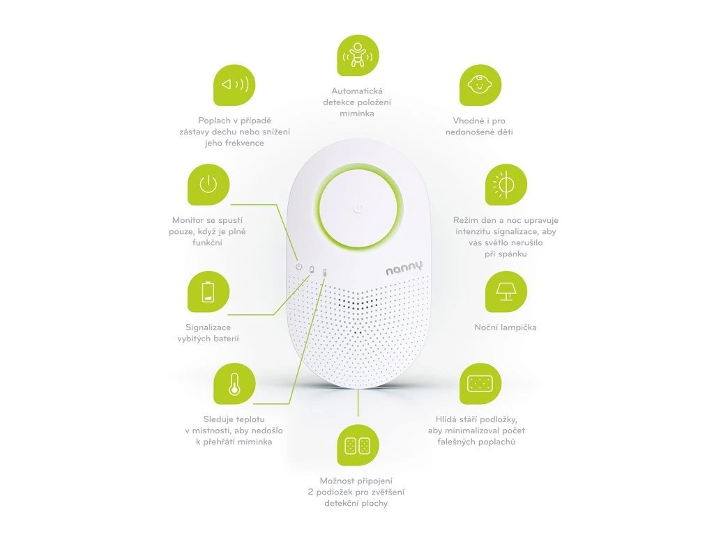Nanny BM-03 je certifikovaný zdravotnický prostředek, který monitoruje dýchání dítěte a je vhodný i pro nedonošená miminka od 1kg hmotnosti. Jako jediný monitor na trhu také hlídá stáří podložky. V případě, že již překročila dobu své životnosti, upozorní vás na to během automatického testu funkčnosti při zapnutí.