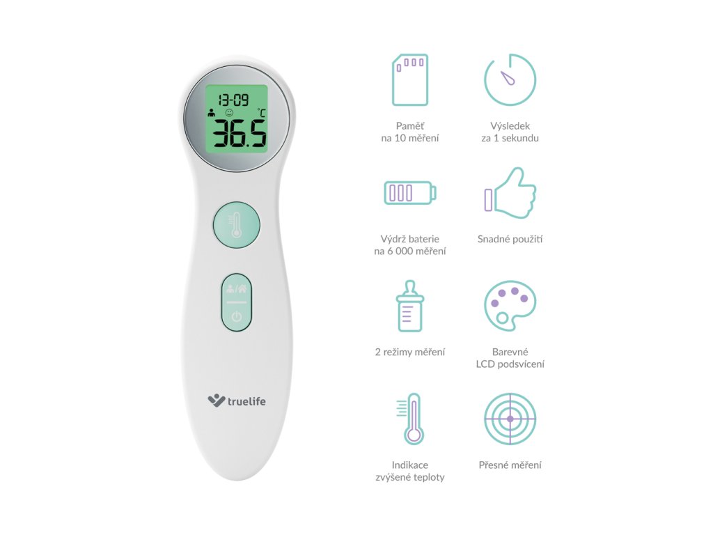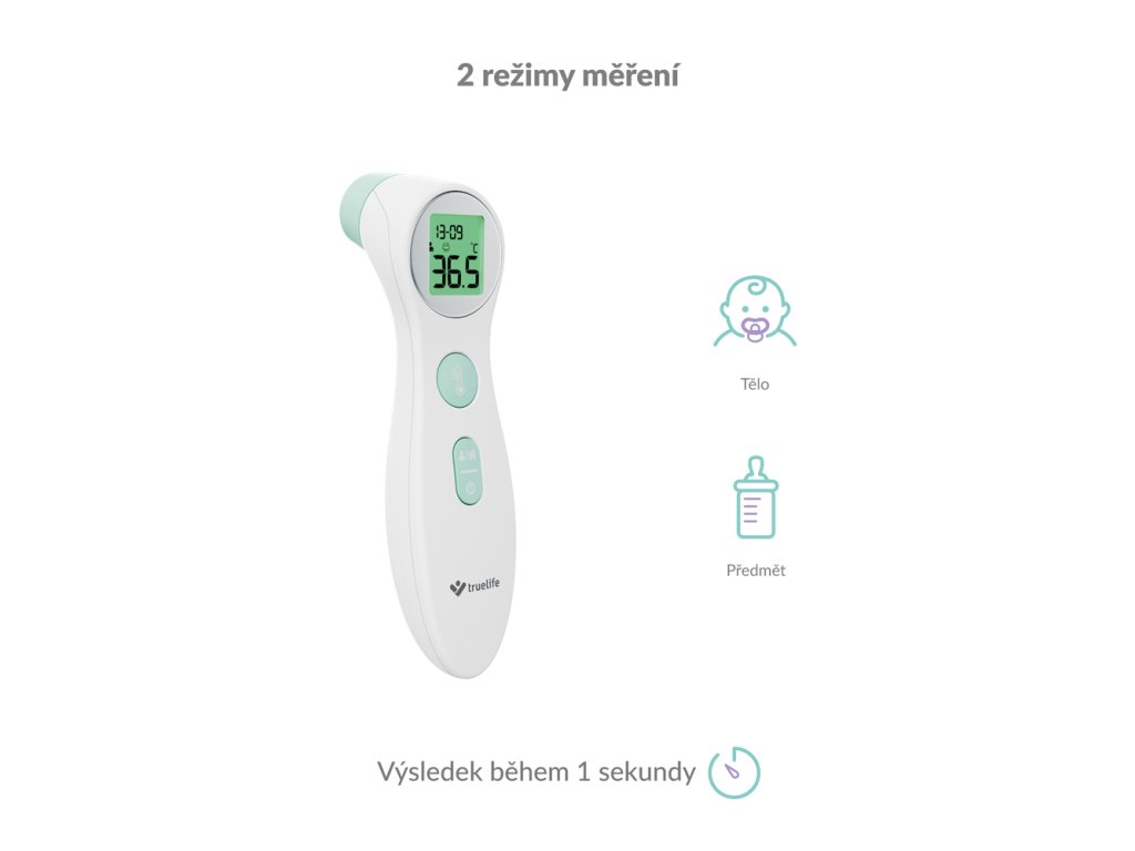 TrueLife Care disponuje dvěma režimy měření teploty. Kromě klasického měření tělesné teploty dokáže změřit i předměty, povrchy, nebo tekutiny. Snadno tak můžete zkontrolovat třeba kojeneckou stravu nebo čaj.