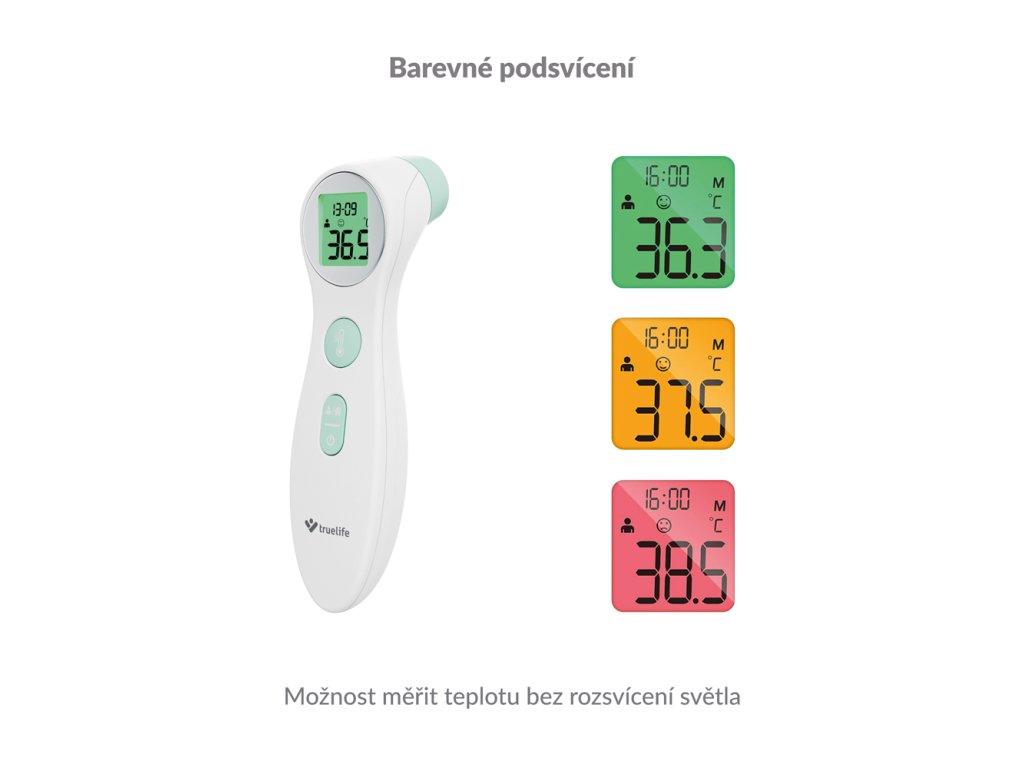 S teploměrem TrueLife Care Q6 nemusíte dlouho čekat, výsledek měření se dozvíte do 1 sekundy od stisknutí tlačítka. Teploměr využívá technologii infračerveného záření a teplotu měří s přesností na 0,1 °C. Bezkontaktní měření je navíc naprosto hygienické a zároveň i pohodlné, teploměr stačí namířit do středu čela a stisknout tlačítko. Pokud potřebujete změřit teplotu dítěti, klidně může zůstat spát a ani nemusíte rozsvěcet světlo. LCD displej má barevné podsvícení a při zvýšené teplotě vás upozorní červené podsvícení.