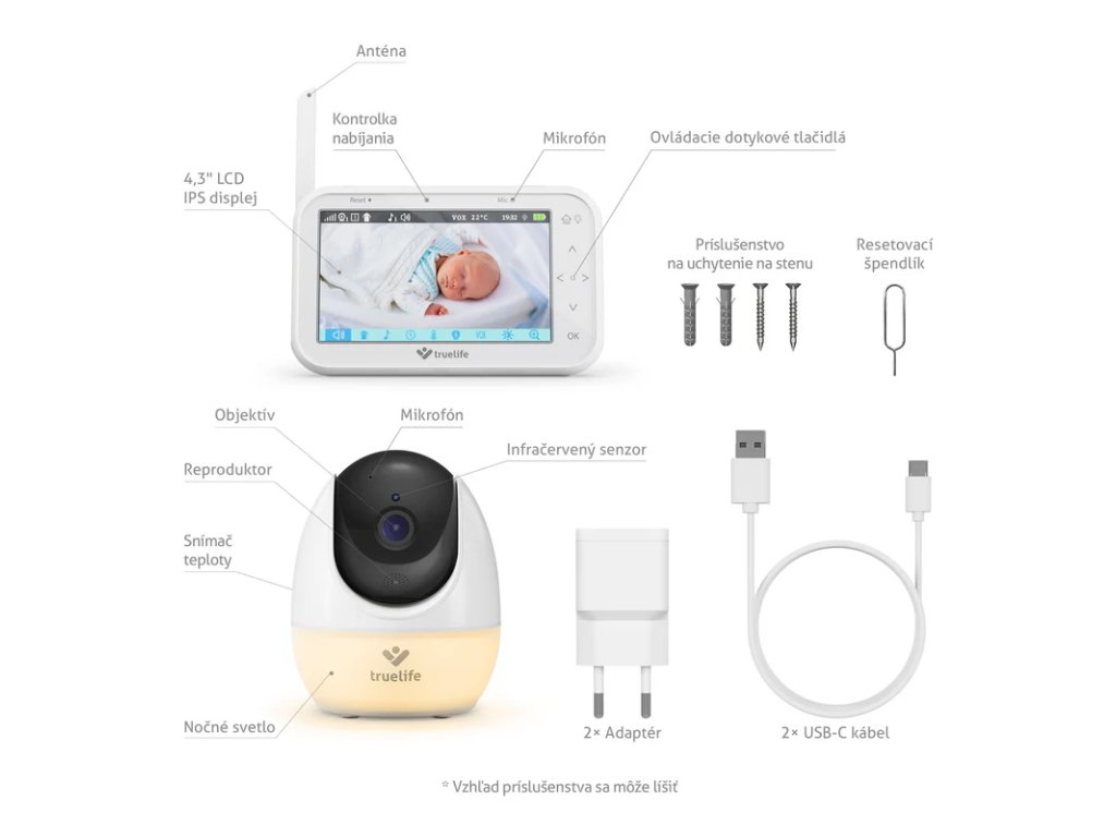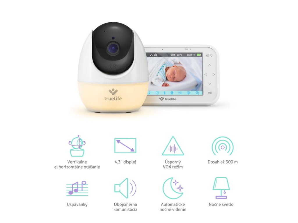 360° rotační chůvička TrueLife NannyCam R4 Pro, 4,3" LCD IPS displej, dosah až 300 m, automatické noční vidění, baterie až 17 h, VOX režim, noční světlo, obousměrná komunikace, 8 ukolébavek, detekce teploty v místnosti, připomenutí.