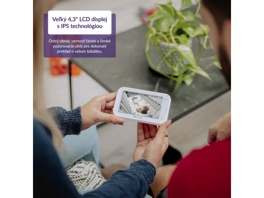 Rodičovská jednotka je vybavena 4,3" LCD IPS displejem. IPS technologie nejen vylepšuje věrnost barev, ale také poskytuje širší pozorovací úhly.