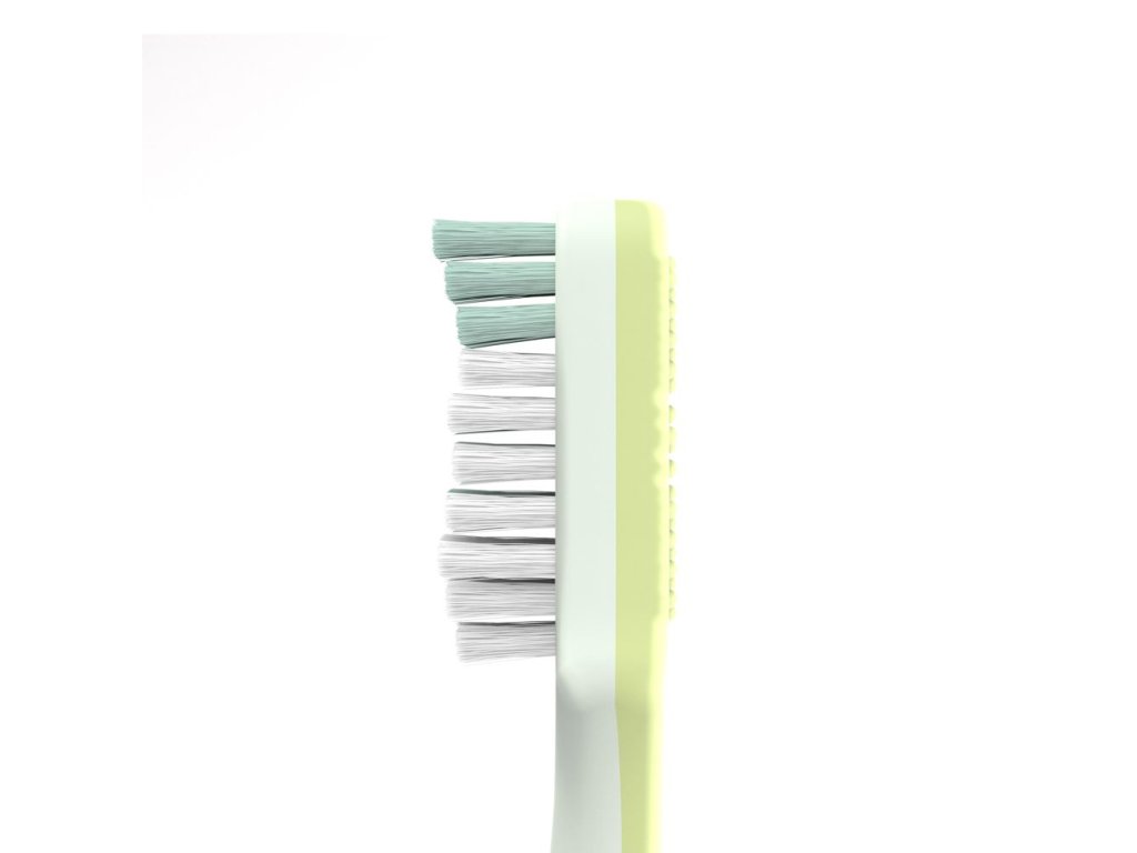 - Má měkké štětinky uspořádané do tvaru ´Z´, které lépe dosáhnou do těžko dostupných míst. Barevné označení na štětinkách pomáhá rodičům snadno dávkovat správné množství zubní pasty - velikosti hrášku