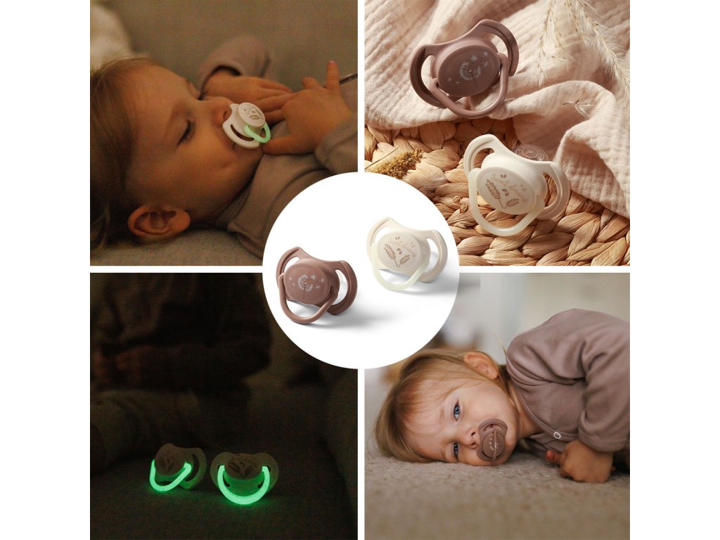 - Denní a noční dudlík – v balení naleznete jeden klasický a jeden se svítící rukojetí, připravený uklidnit dítě i v noci