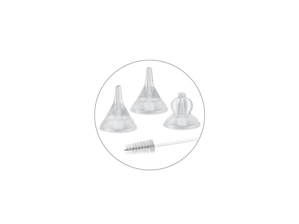 3 Měkké silikonové nástavce Ultra měkké 3 silikonové nástavce, které lze přizpůsobit typu sekretů a věku děťátka. Obsahuje také přídavný čistící kartáček. Zaručeně hygienické a přizpůsobené potřebám těch nejmenších.