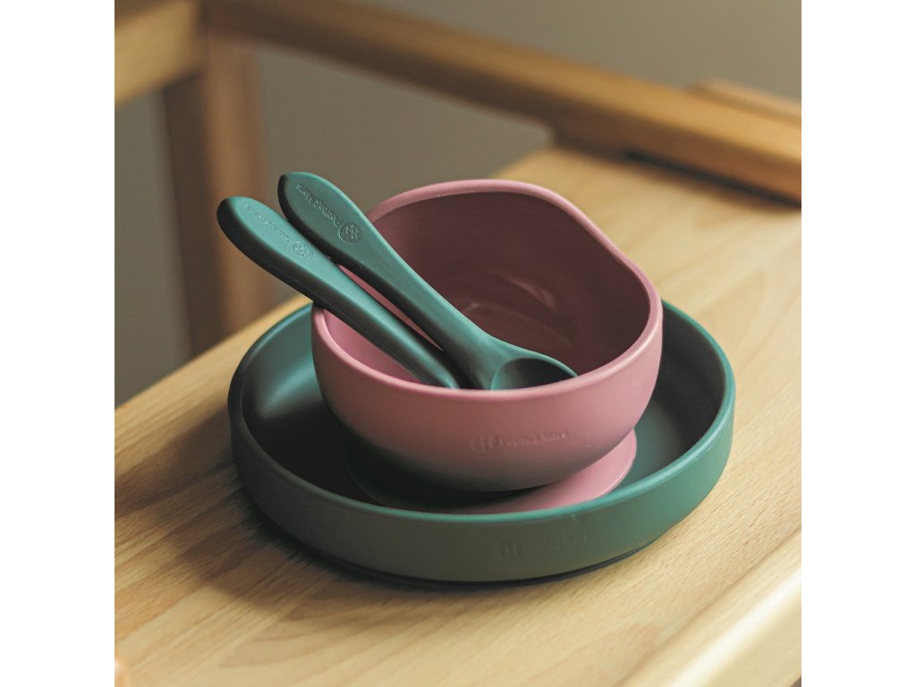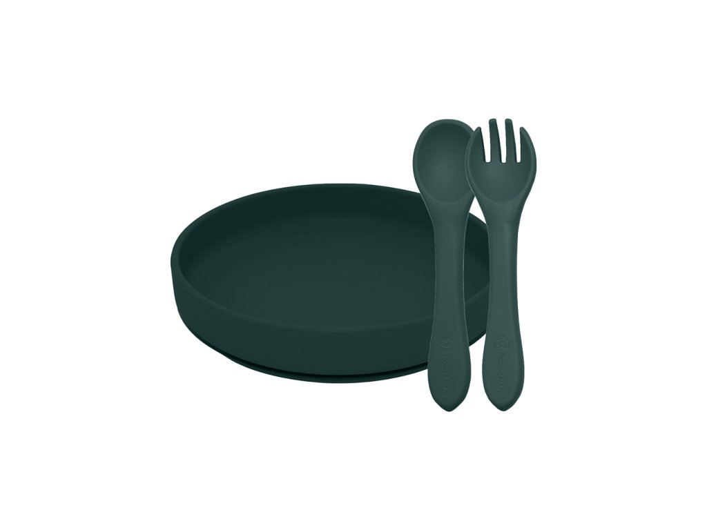PETITE&MARS Set jídelní silikonový TAKE&MATCH 2 ks talíř + příbor Misty Green 6m+