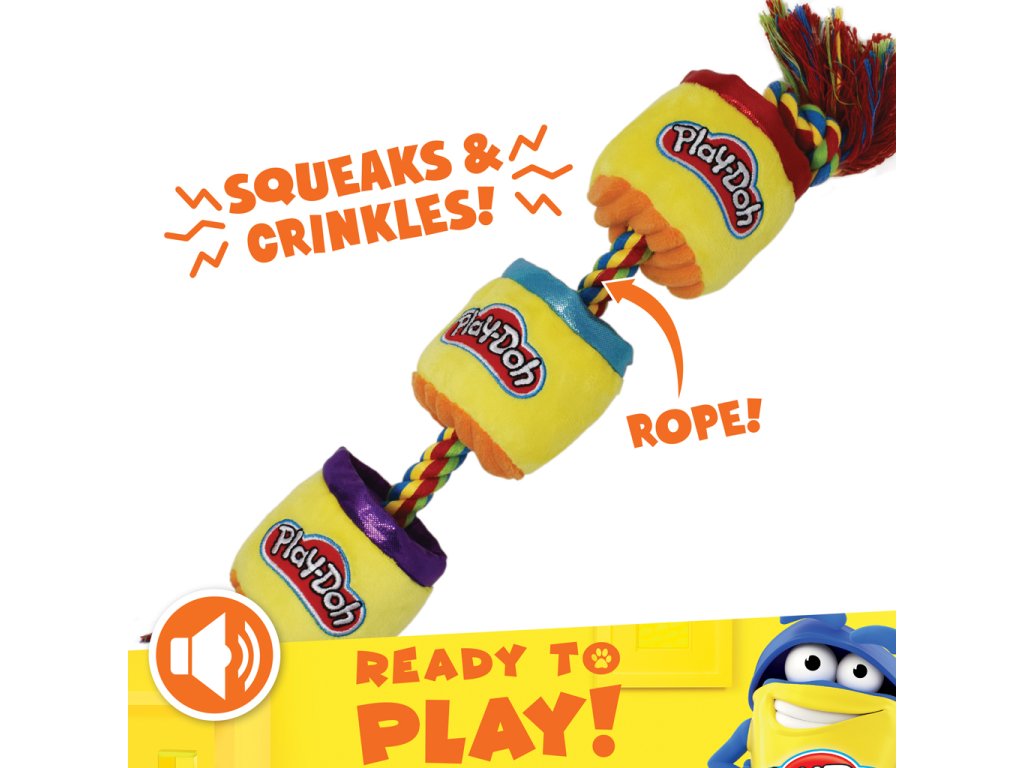 Zábava a nostalgie v jednom! Plyšová hračka Hasbro Play-Doh Can s pískacím a šustícím efektem a pevným lanem na tahání přinese vašemu psovi hodiny radosti. Oficiální produkt Hasbro v ikonickém Play-Doh designu – bezpečný, barevný a stvořený pro nekonečnou hru.
