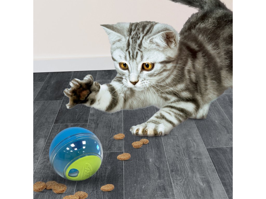 Hračka je interaktivní míček o průměru přibližně 9 cm, určený pro kočky pro zábavné a stimulující krmné aktivity. Do míčku můžete vložit malé pamlsky nebo suché krmivo a kočka jej musí točit, odhazovat či bouchat, aby se pamlsky vydaly ven - tím podporuje nejen pohyb, ale i mentální zapojení. Hračka je ideální. chcete její hru ozvláštnit.