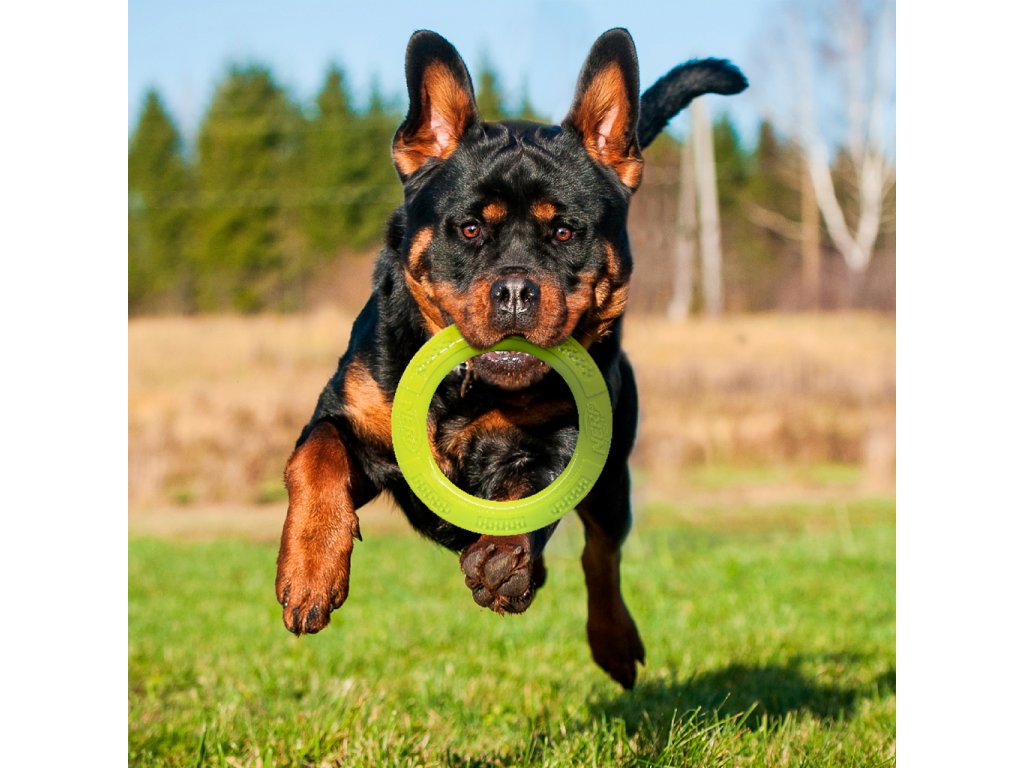Hračka je kruhový prsten o průměru přibližně 23 cm, navržený pro interaktivní hru mezi psem a majitelem – ideální pro tahání („tug of war“), aportování nebo společné hry.