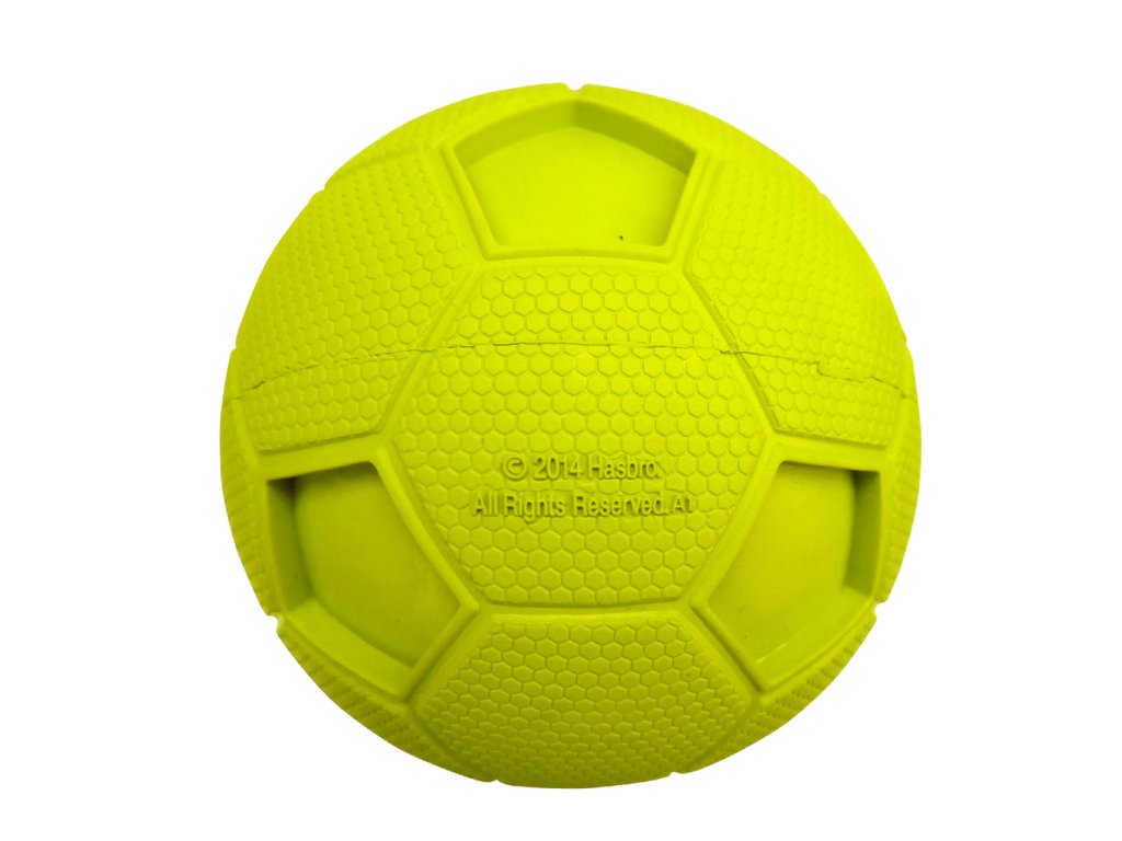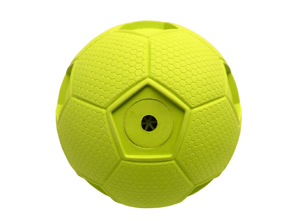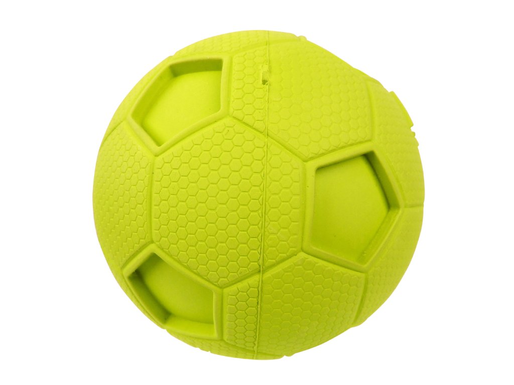 Hračka je míček o průměru přibližně 10 cm, navržený pro aktivní hru a aportování se psem. Tvar fotbalového míče spolu s robustním gumovým tělem umožňuje házení, odrážení a chytání – ideální hračka pro vnější i vnitřní aktivitu.