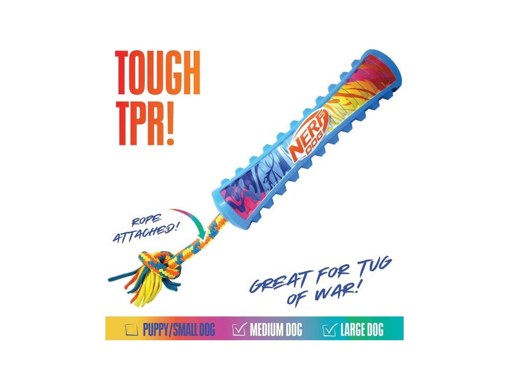 Nerf Dog Color Blast Stick s lanem je ideální pro hru protahování lanem! Je vyrobena tak, aby vydržela spoustu žvýkání a tahání. Rukojeť z lana pomáhá vašemu psovi bezpečně se držet, když si hraje s vámi nebo jiným přátelským štěňátkem. Tento fotbalový míč vydává pisklavé zvuky, které psi milují!