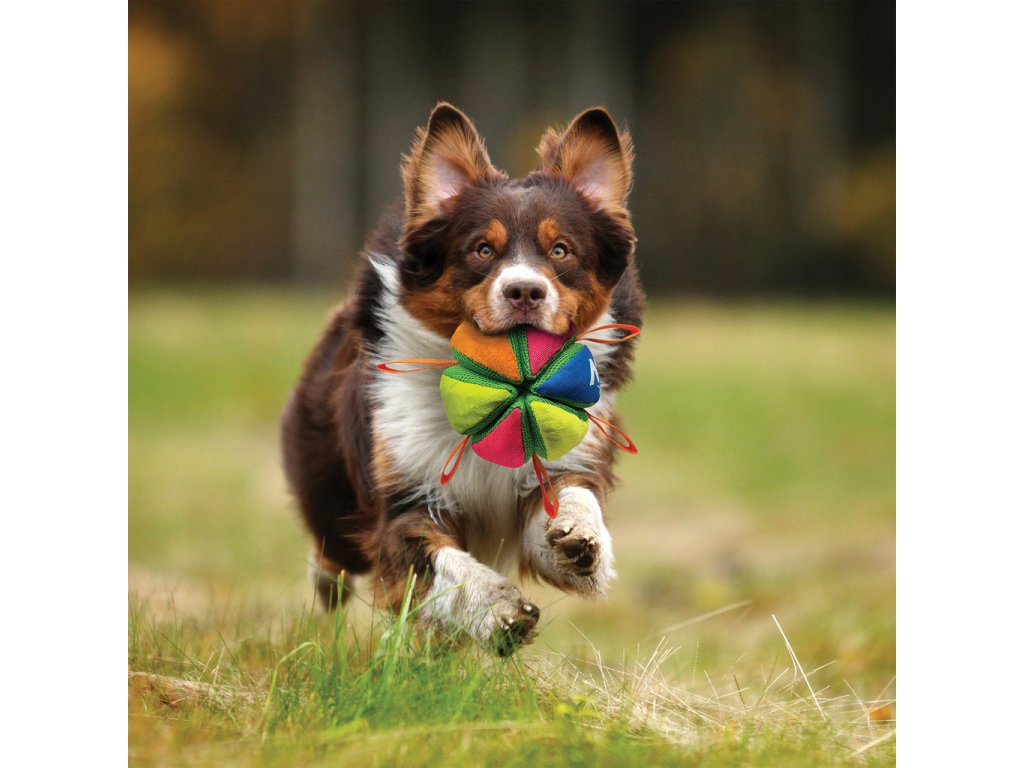 - Díky vestavěným nylonovým popruhům není míček určený jen k aportování – tato hračka nabízí také hru s přetahováním, nošením a interaktivní zábavu s majitelem.