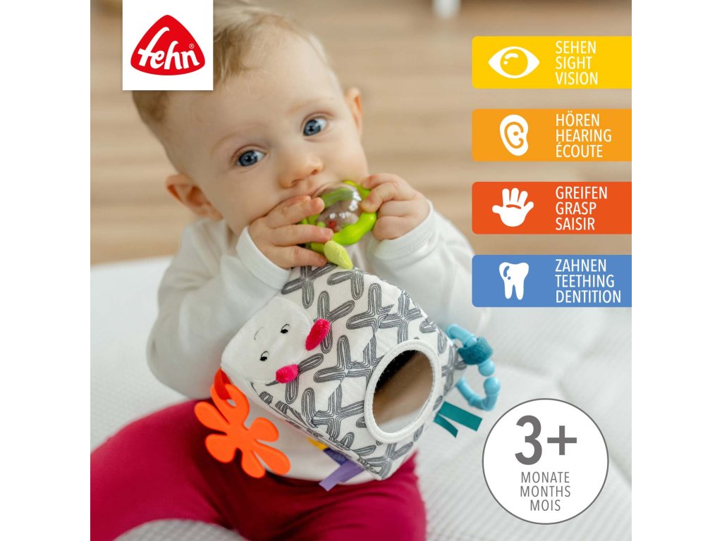 Díky chrastítku, úchopovým kroužkům, rolničce, měkkému kousátku a zrcátku nabízí