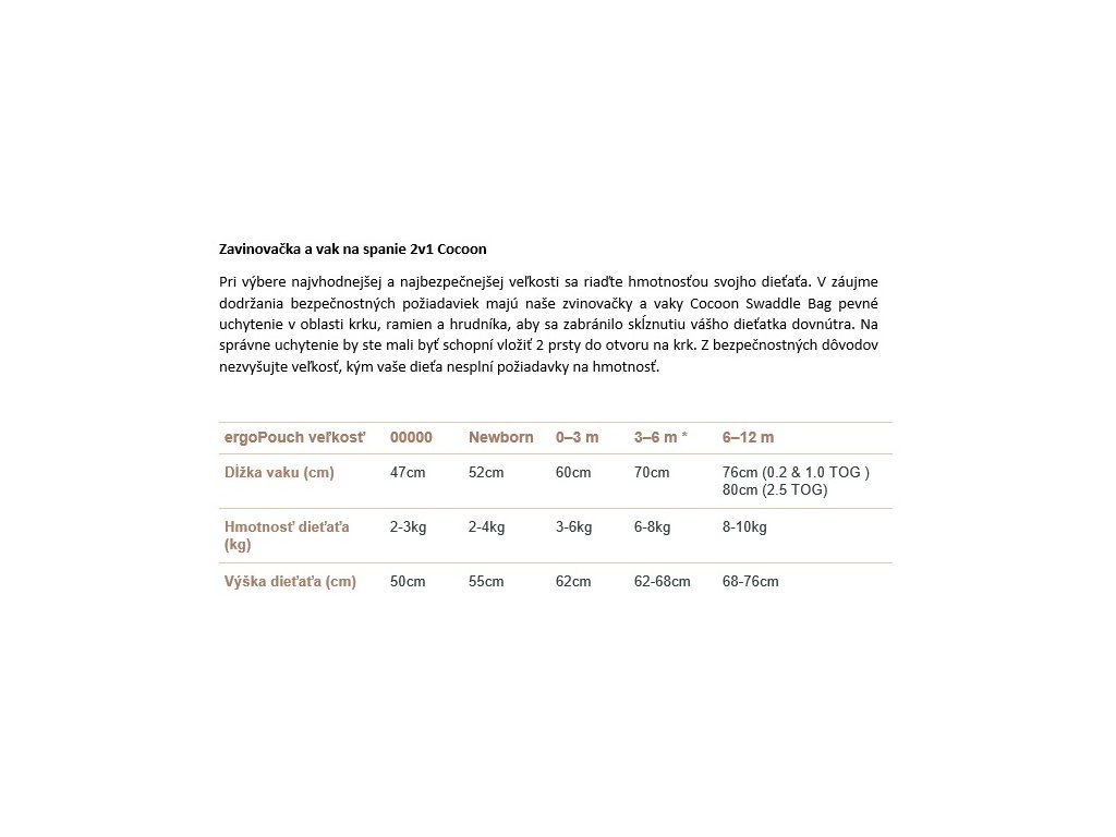 Upozornění: Udržujte mimo dosah tepla a otevřeného ohně. Pro bezpečnější spánek nepoužívejte zavinovačky ani spací pytle, spíte-li spolu s dítětem. Ruce by měly být volné, pokud dítě vykazuje známky otáčení. Návod na oblékání slouží pouze jako návod. prosím, zvažte další faktory, jako je nemoc, klimatizace a to, zda má vaše dítě tendenci být horké nebo studené.