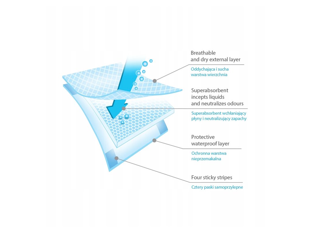 - Čistota a pohodlí – superabsorpční materiál účinně pohlcuje tekutiny a neutralizuje pachy.