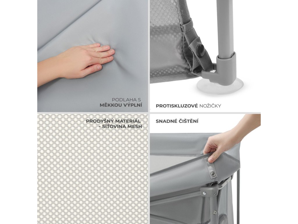 - Měkká podlaha a síťované boky: Polstrovaná podložka poskytuje pohodlí při hře, zatímco síťované boky zaručují dobrou cirkulaci vzduchu a umožňují rodičům mít dítě stále na očích.