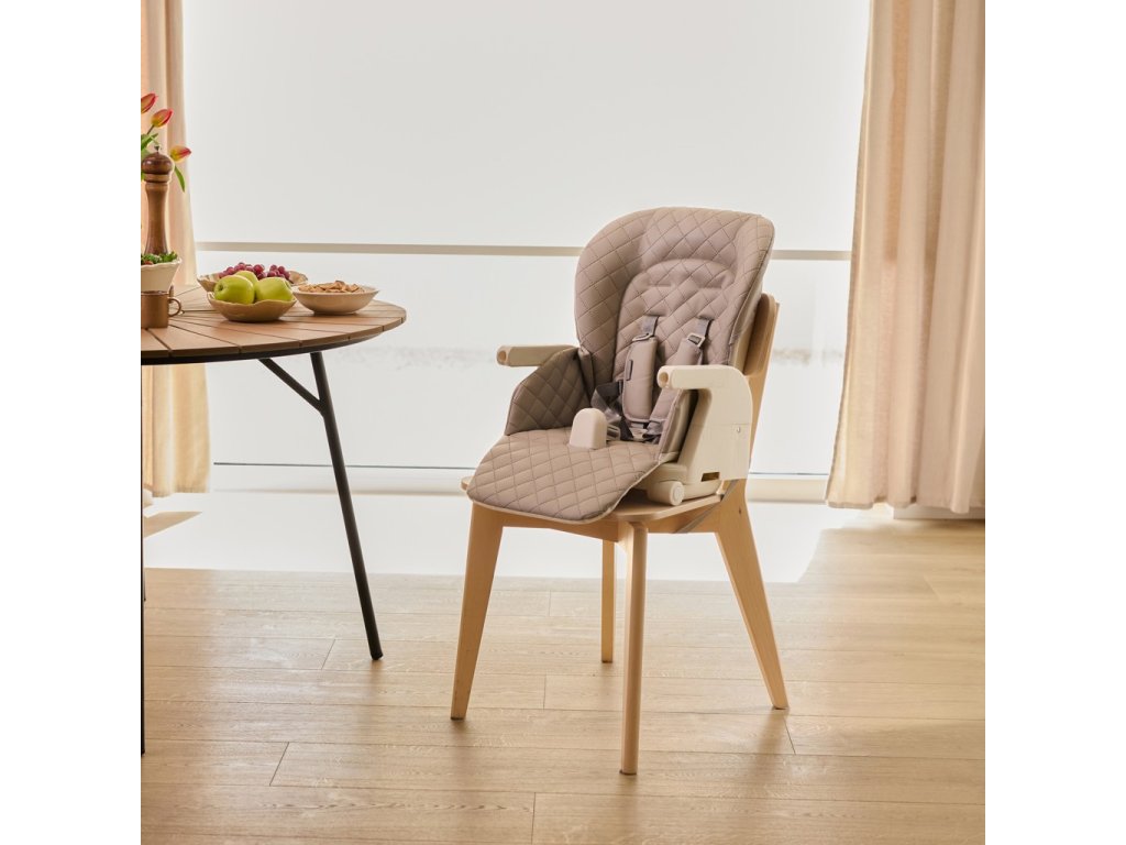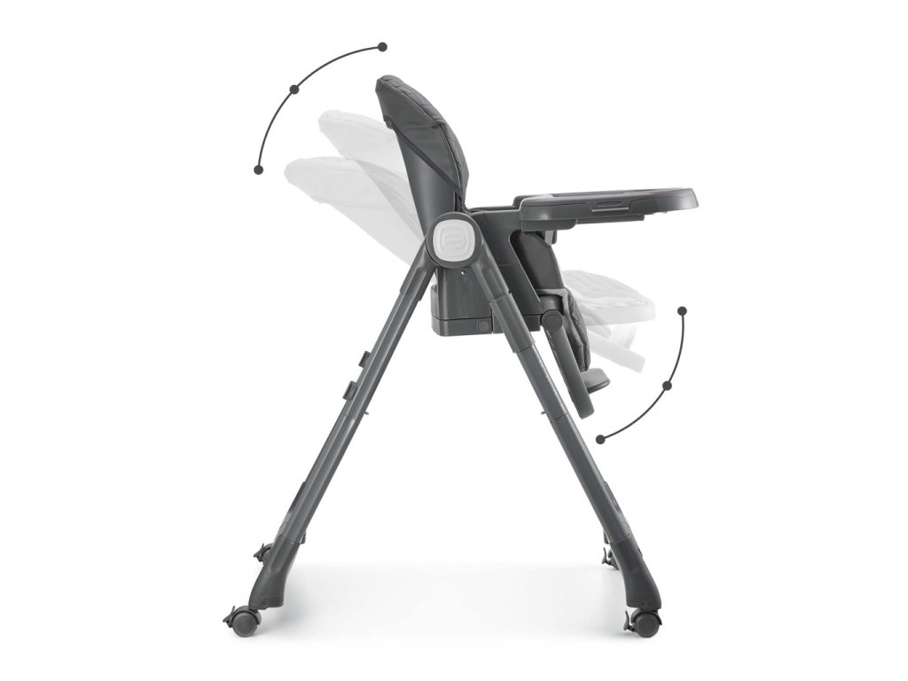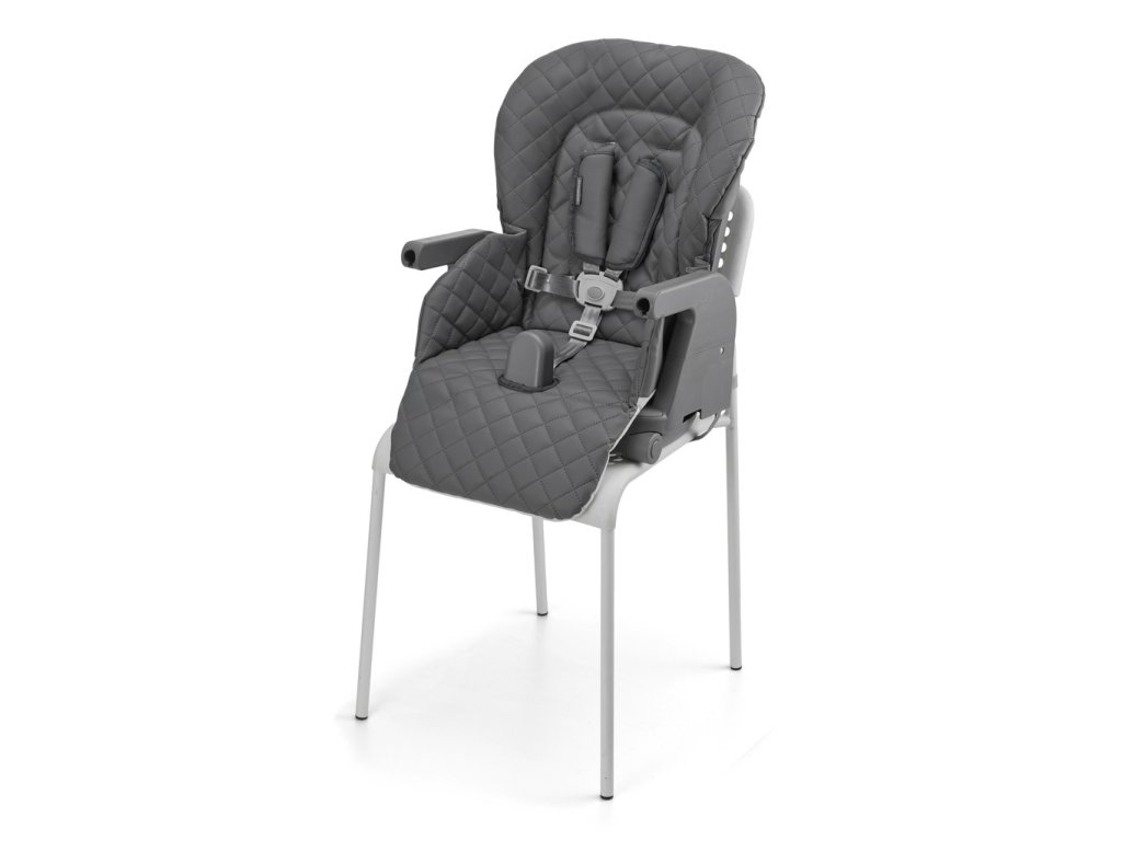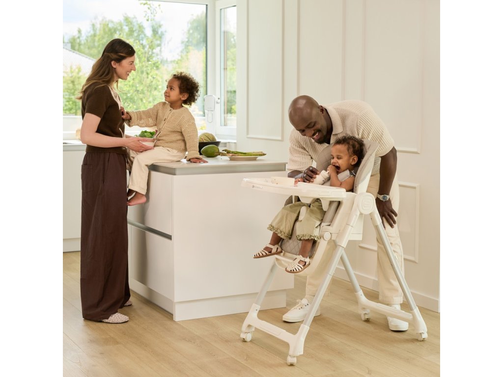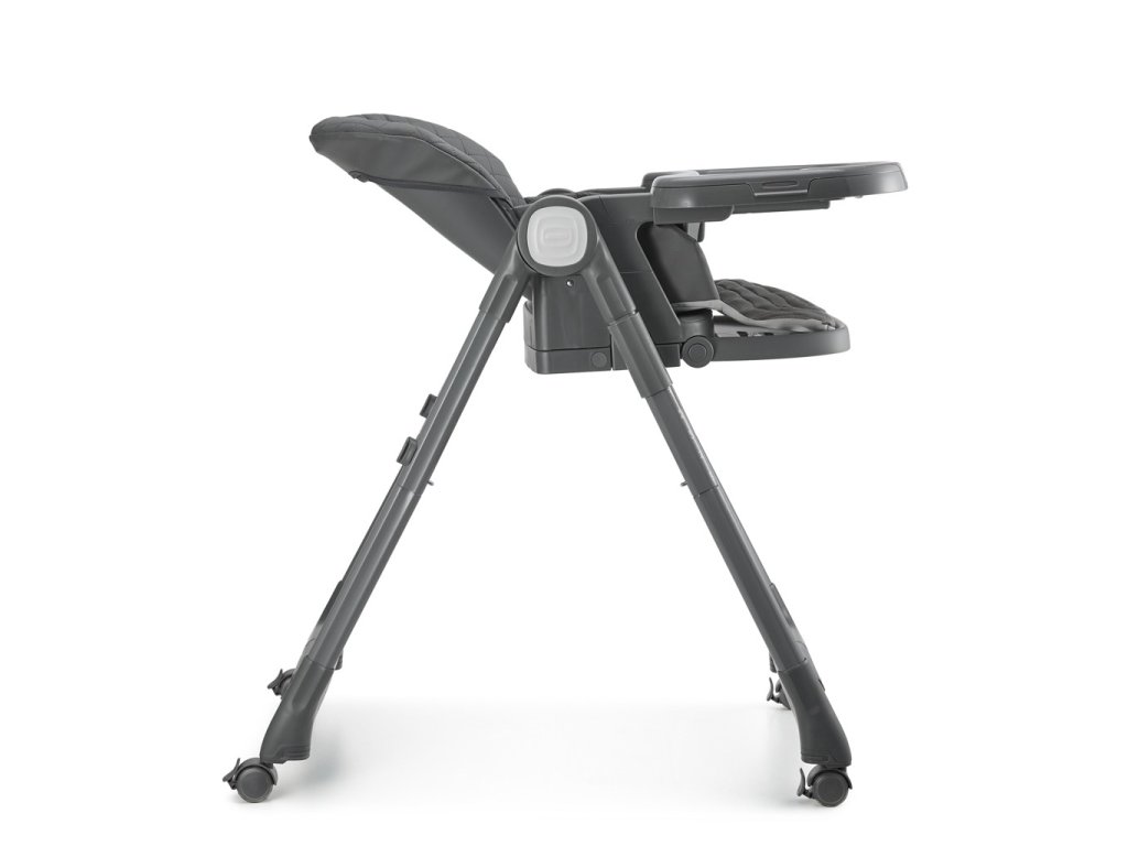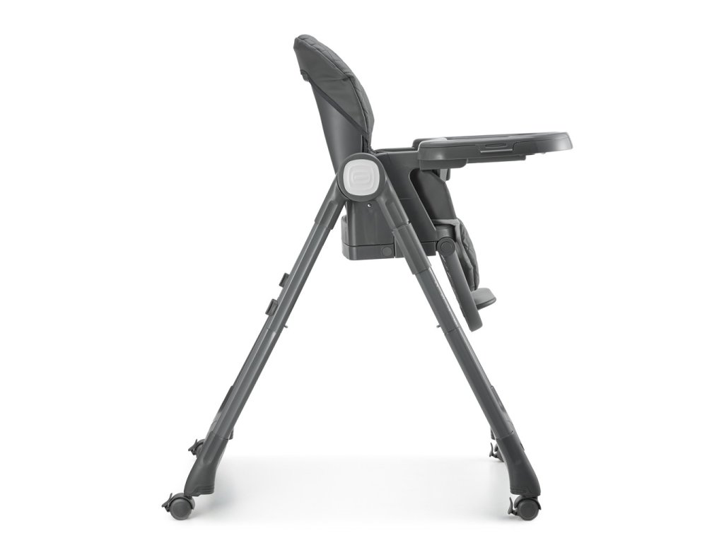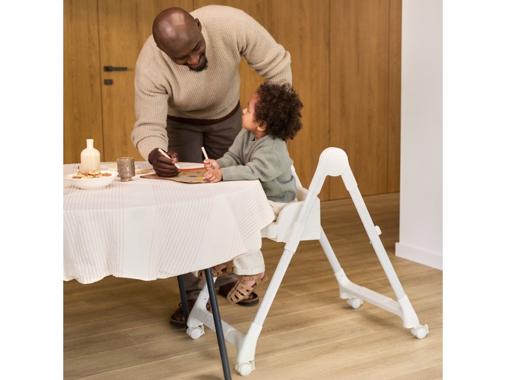 Integrovaná kolečka s brzdami, 5-bodové bezpečnostní pásy a měkké, snadno čistitelné PU čalounění zvyšují pohodlí a bezpečnost dítěte. Po složení má židle mimořádně kompaktní tvar, což usnadňuje její uskladnění. Zabírá minimum místa, takže se snadno vejde do rohu nebo skříně.