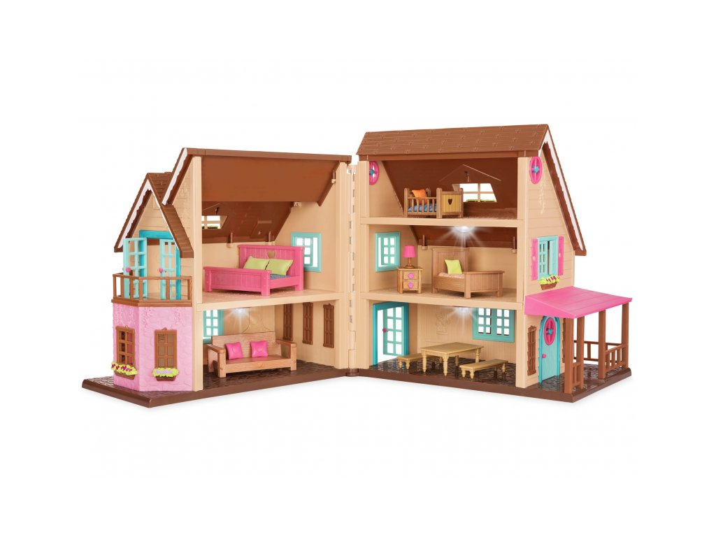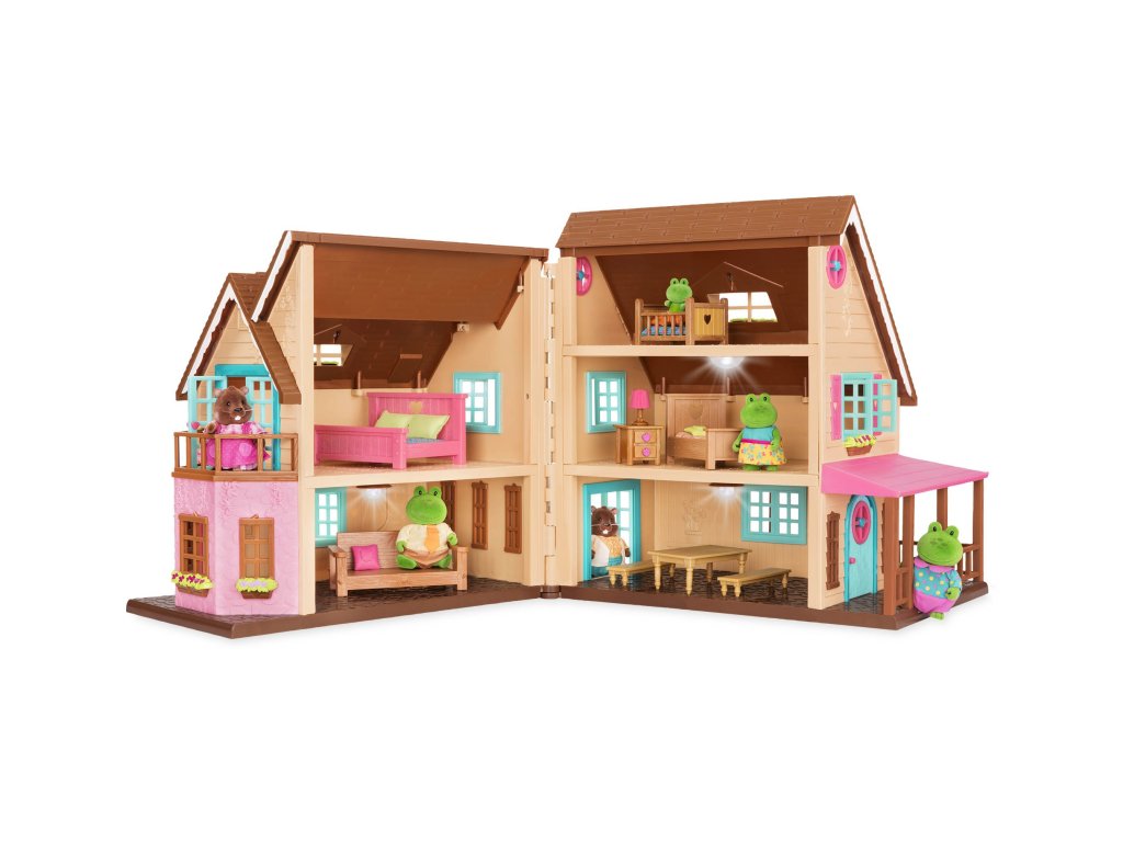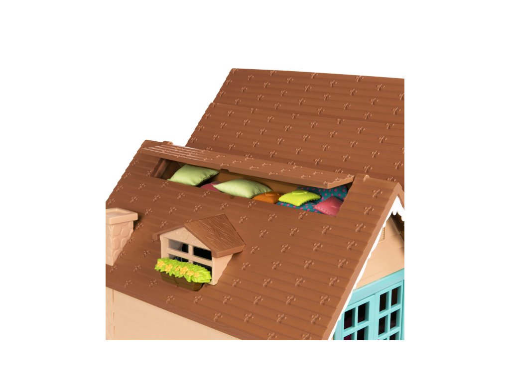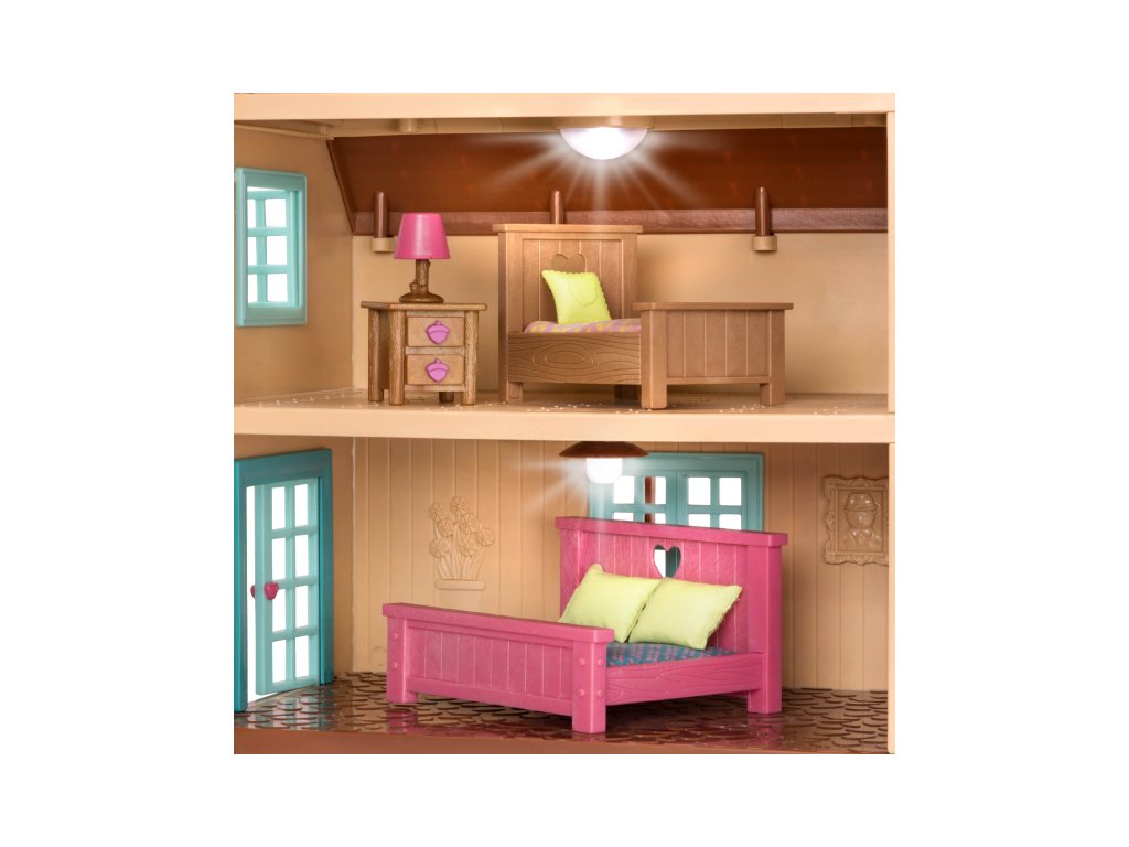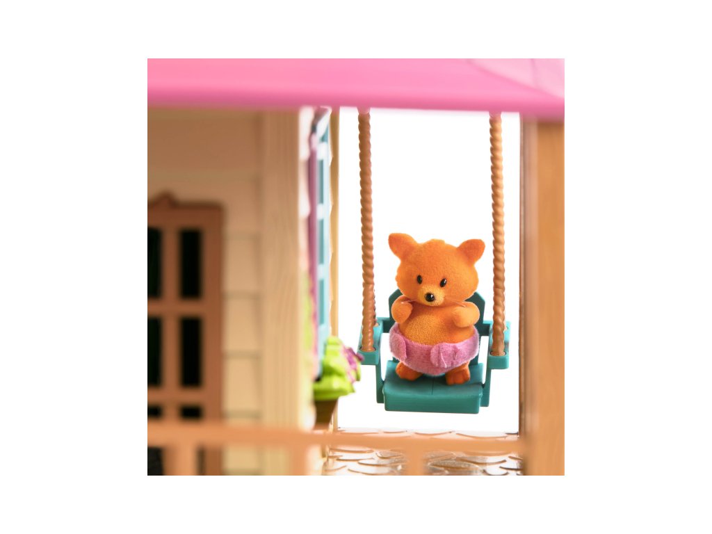 Otevírací 3-patrový domeček Hillside Cottage poskytuje nádherné bydlení postavičkám zvířátek Li'l Woodzeez. Uvnitř najdete nábytek včetně postelí pro celou rodinu, stolu se židlemi, pohovky atd. Ložnice v horním patře má vstup balkon, v přízemí je krásná veranda pro relaxaci venku a houpačka pro zábavu dětí. A když se večer setmí, můžete zapnout vnitřní i venkovní osvětlení!