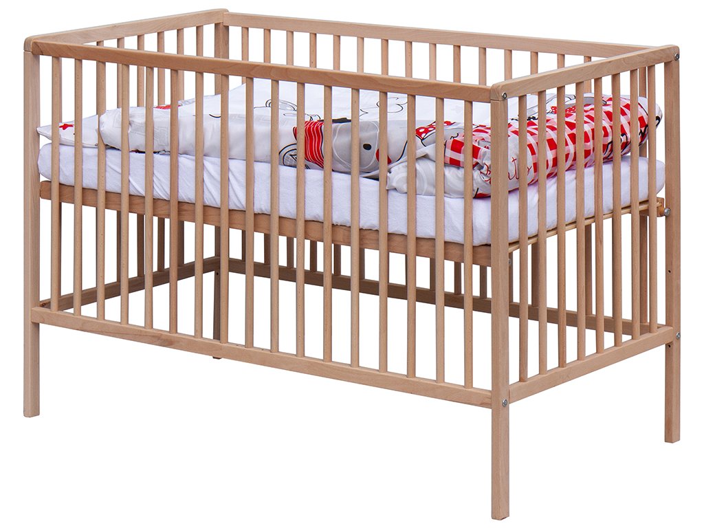 1. Dětská dřevěná postýlka 120 x 60 cm - přírodní, masiv borovice, 3 vyndavací příčky, 3 polohy roštu,