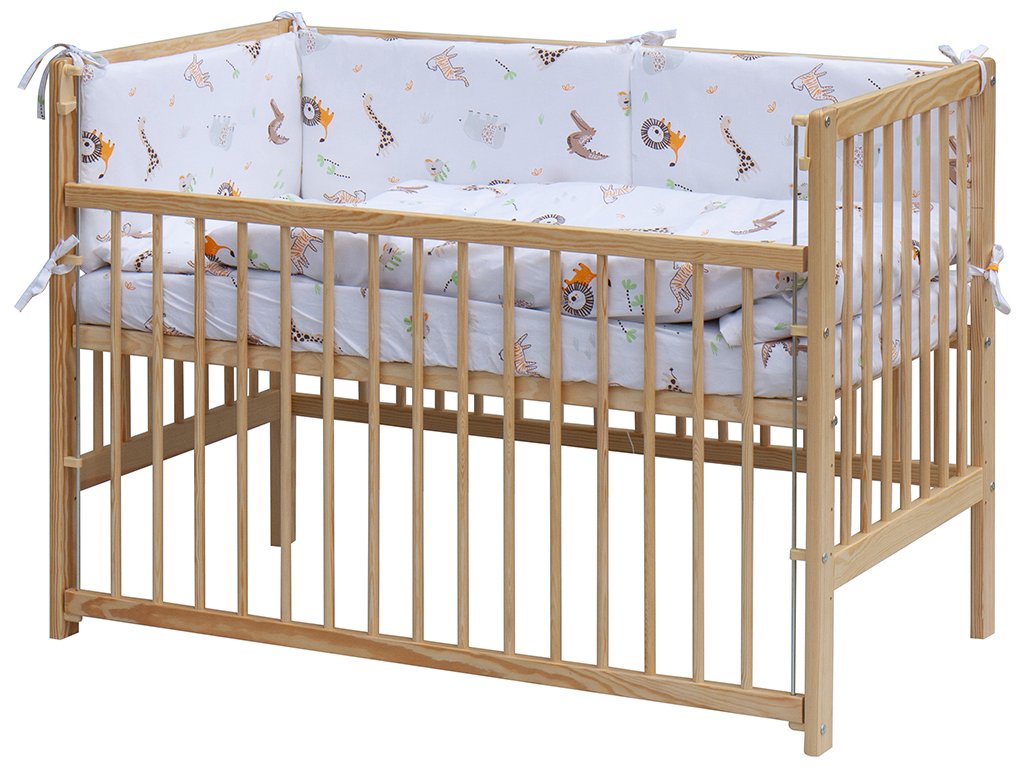 1. Dětská dřevěná postýlka 120 x 60 cm - přírodní, masiv borovice, stahovací bok, 6 poloh roštu