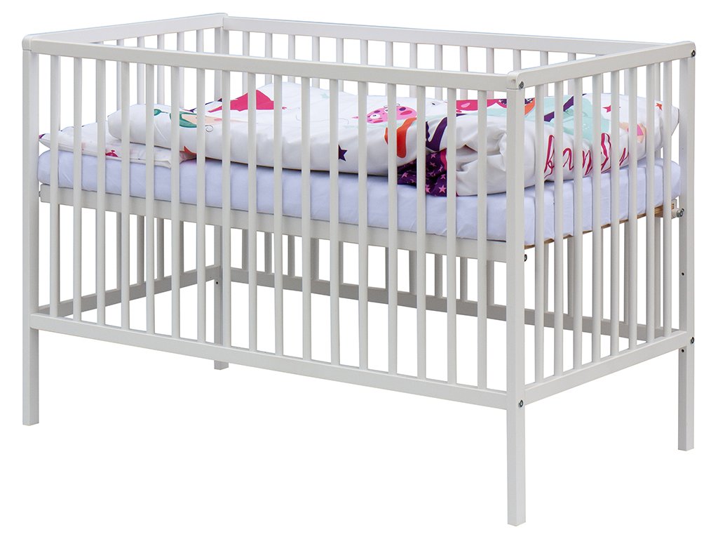 1. Dětská dřevěná postýlka 120x60 cm - bílá, masiv buk, 3 vyndavací příčky, 3 polohy roštu