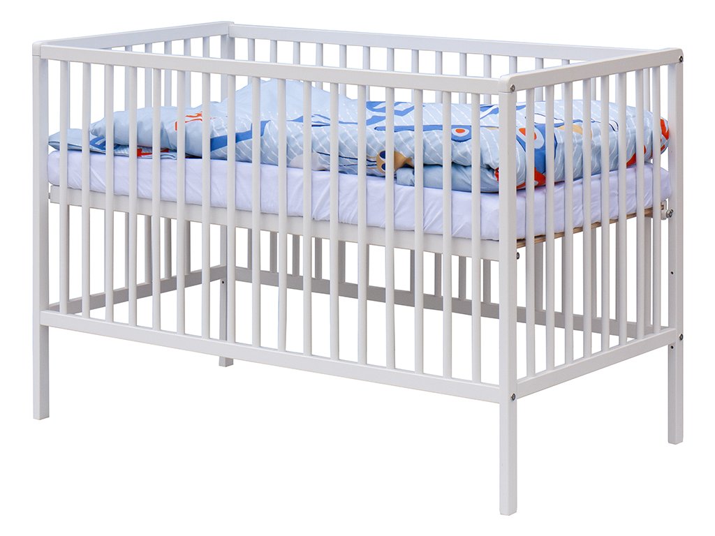 1. Dětská dřevěná postýlka 120x60 cm - bílá, masiv buk, 3 vyndavací příčky, 3 polohy roštu
