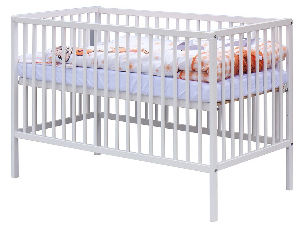 1. Dětská dřevěná postýlka 120x60 cm - bílá, masiv buk, 3 vyndavací příčky, 3 polohy roštu