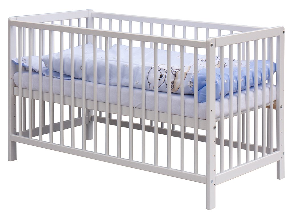 1. Dětská dřevěná postýlka 120x60 cm - bílá, masiv borovice, 3 vyndavací příčky, 5 poloh roštu