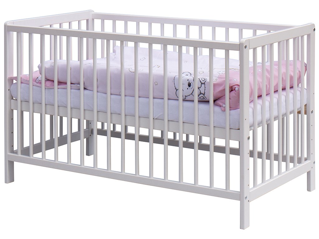1. Dětská dřevěná postýlka 120x60 cm - bílá, masiv borovice, 3 vyndavací příčky, 5 poloh roštu