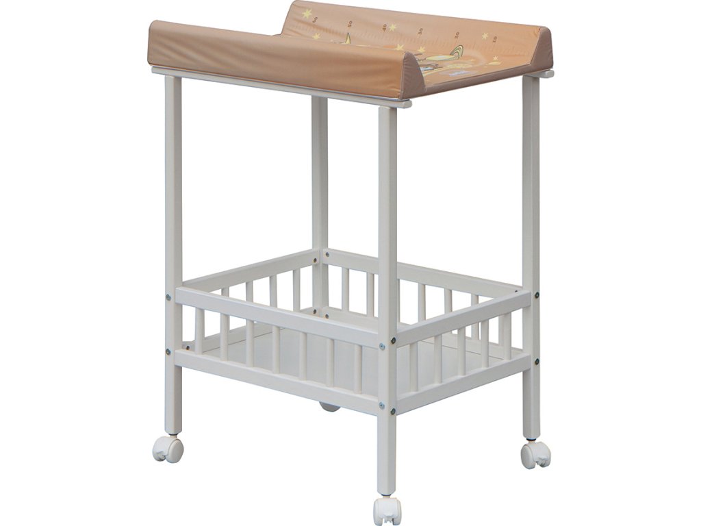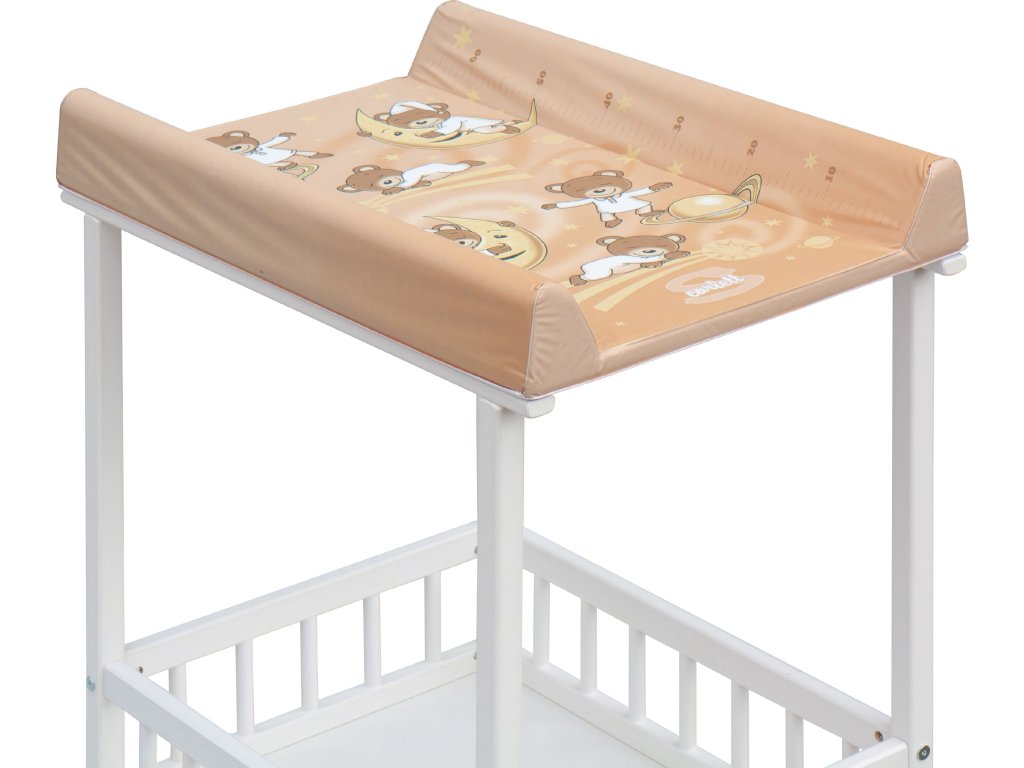 Praktický přebalovací pult se dvěmi policemi z HDF desky. Vrchní přebalovací pult z polyuretanu potažený omyvatelným PVC, vyztužený MDF deskou.