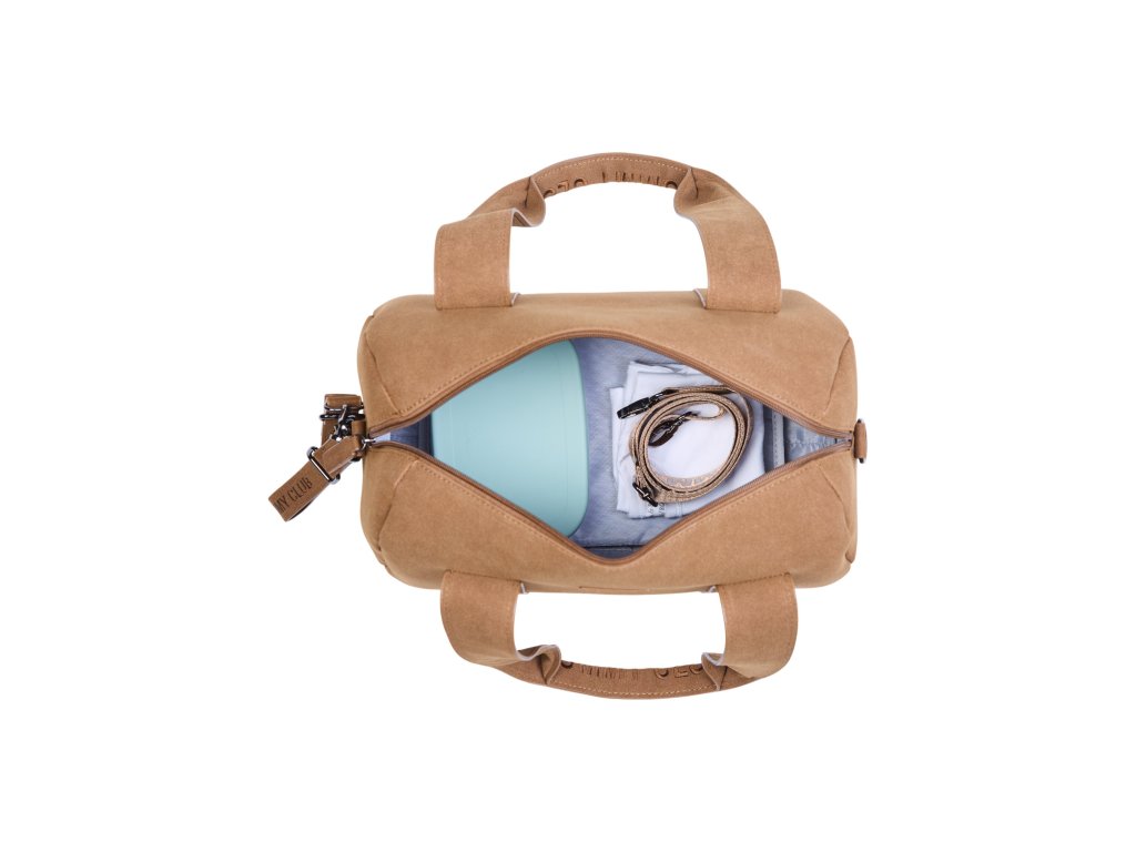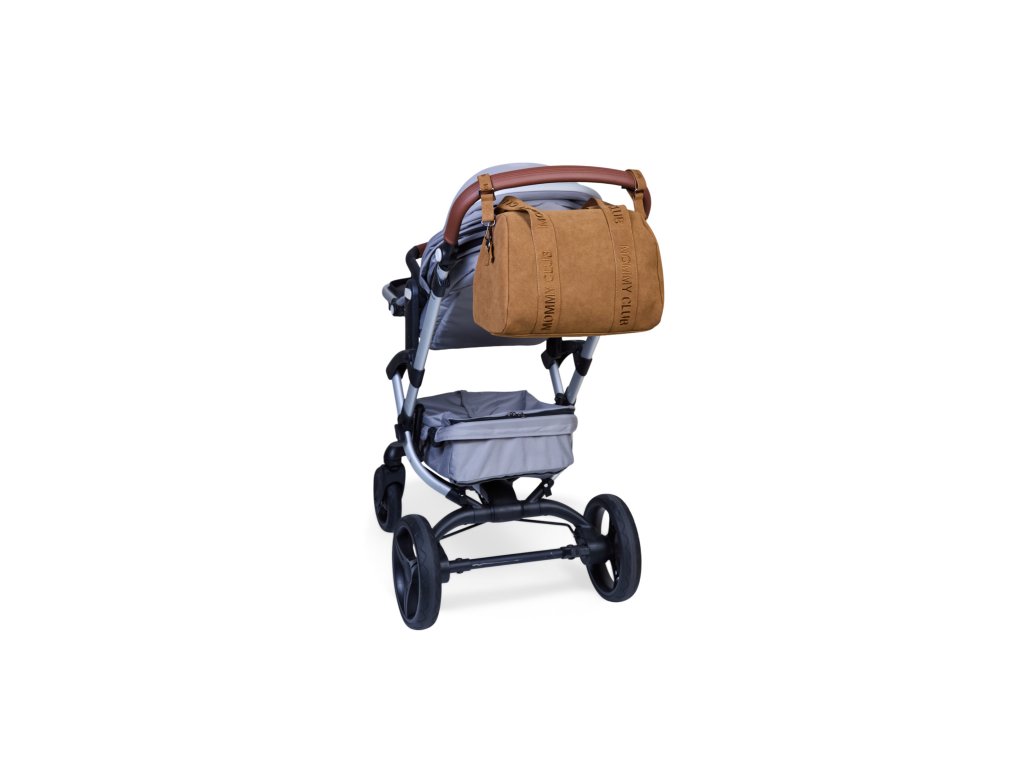 Přebalovací taška s uzavíráním na zip je vybavena držadly pro nošení v ruce, popruhem pro nošení přes rameno i úchyty pro zavěšení na kočárek.