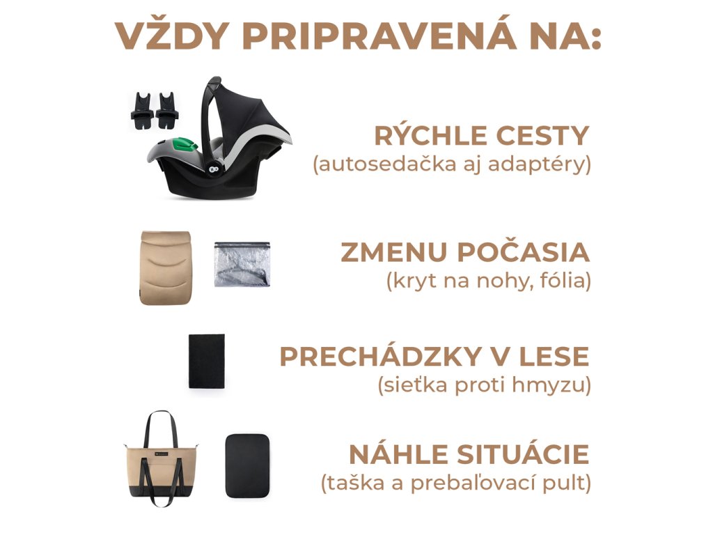 Kočárek se dodává s praktickým příslušenstvím: elegantní taška s cestovní přebalovací podložkou, pláštěnka proti dešti, síťka proti hmyzu, dětská autosedačka s adaptéry, matrace do vaničky, nánožník (pro sportovní kočárek i pro vaničku).