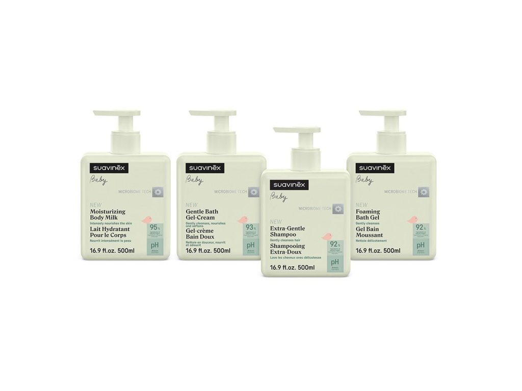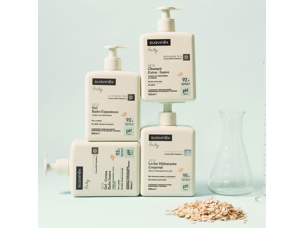 Nová řada svým složením inovované dětské pečující kosmetiky Suavinex přišla právě na pulty španělských lékáren. S jedinečným složením inspirovaným kožním mikrobiomem. Odbornost značky v péči o dětskou pokožku je zárukou úspěchu těchto čtyř produktů: Pěnový koupelový gel 500m, EXTRA jemný - šampon 500ml, Hydratační tělové mléko 500 ml a JEMNÝ koupelový krémový gel 500ml.