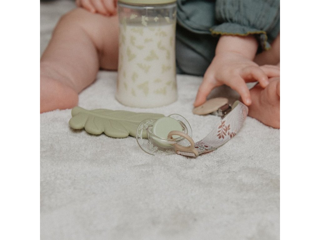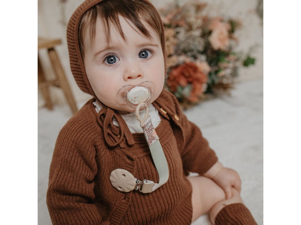 Připevněte klip k oblečení dítěte pomocí svorky. Druhý konec připevněte k dudlíku pomocí textilního poutka. Používejte vždy pod dohledem dospělé osoby.