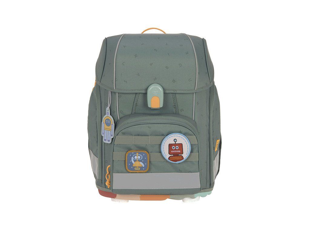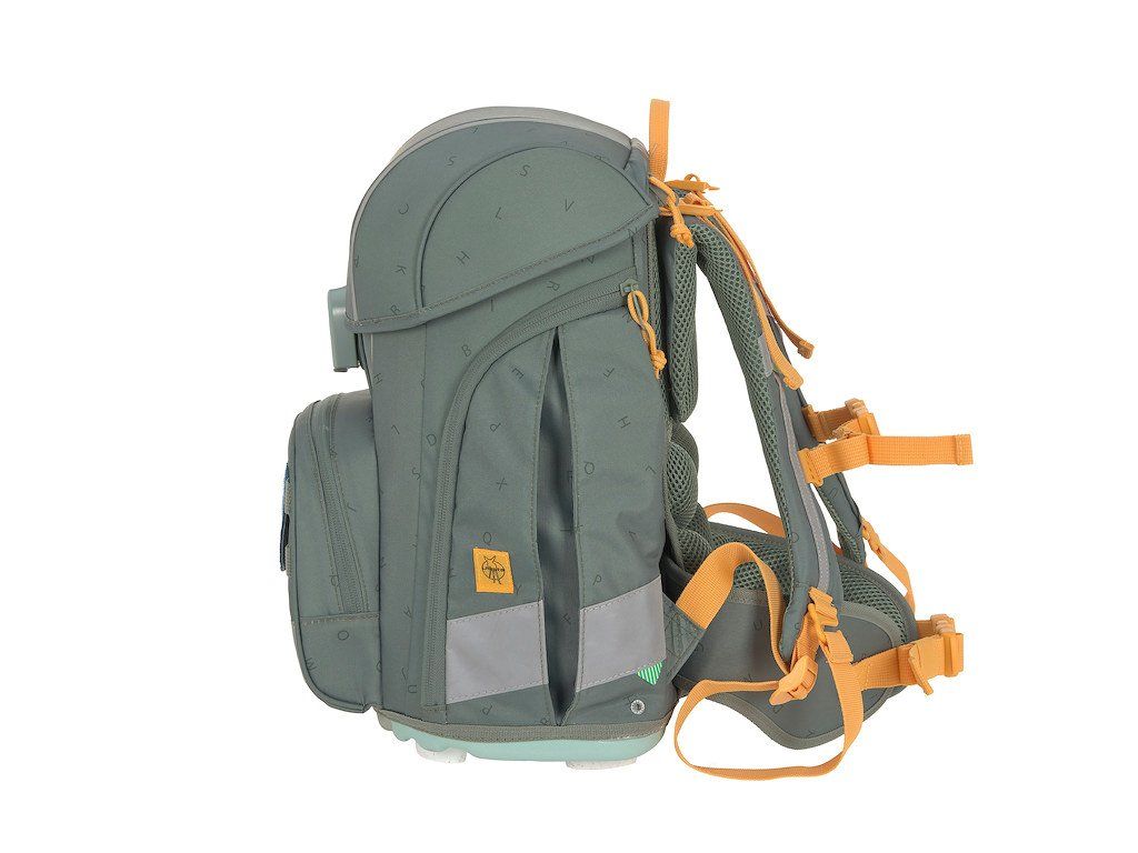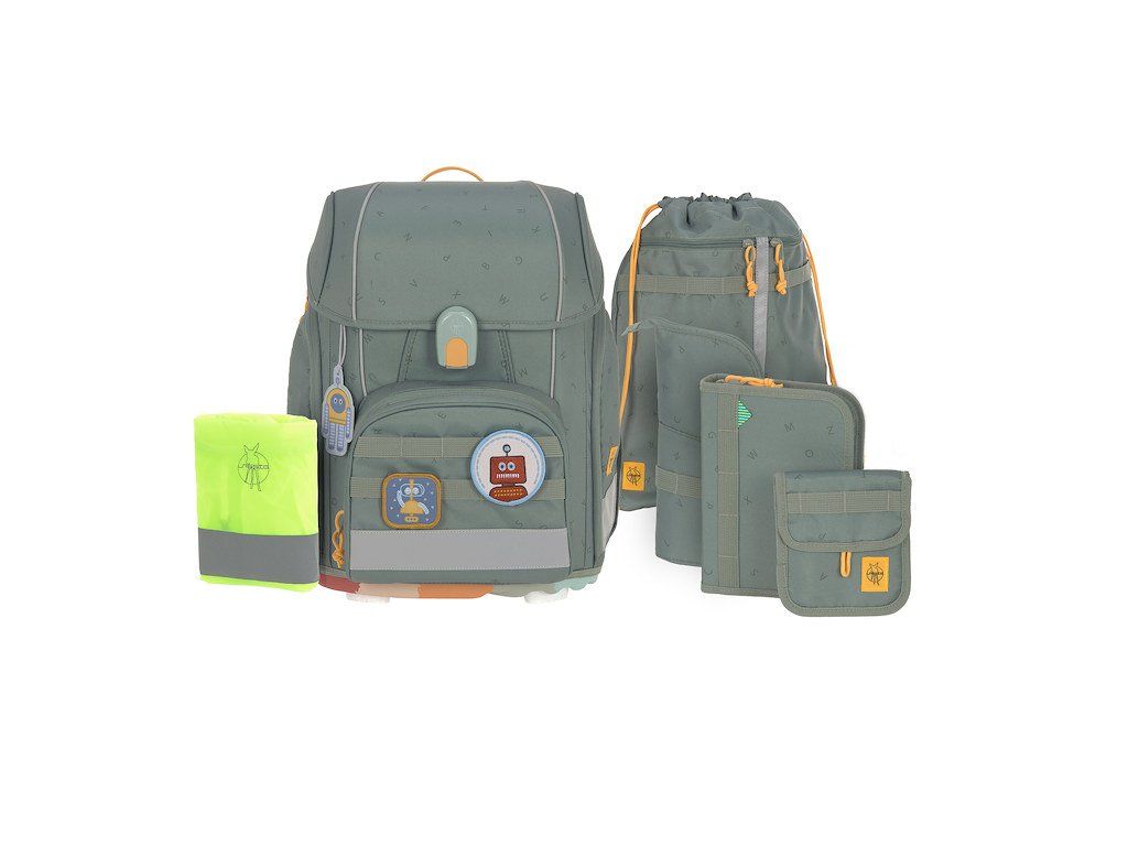 Praktický sedmidílný školní set obsahuje: školní batoh, sportovní vak, velký vybavený penál, kapsičku na krk, malý penál se zipem, pláštěnku a sadu skládající se z přívěsku a 2 nášivek určených k ozdobení setu.