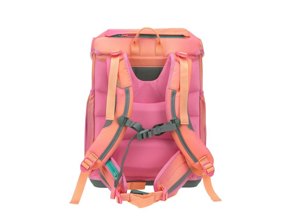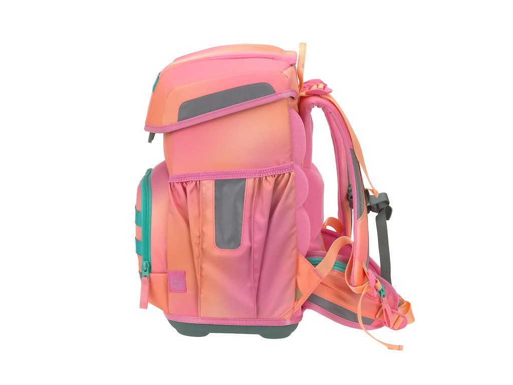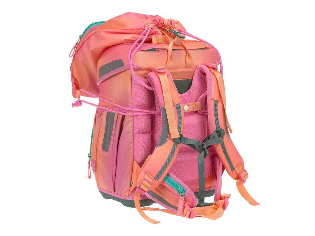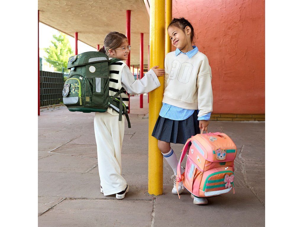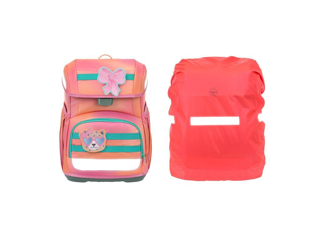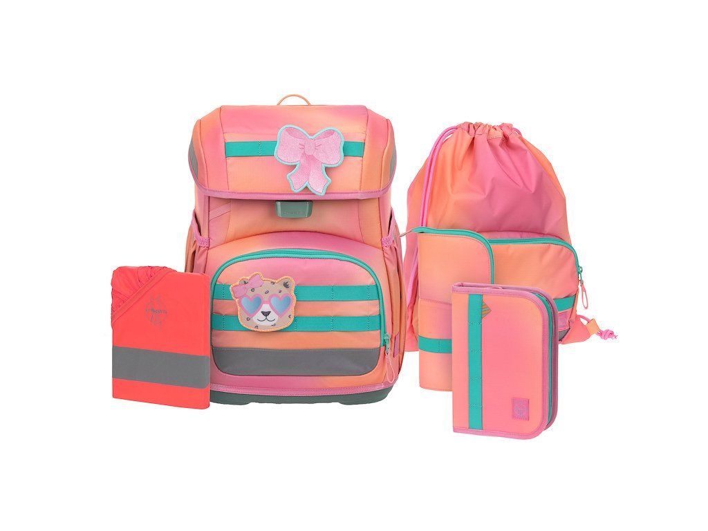 Praktický šestidílný školní set obsahuje: školní batoh, sportovní vak, velký vybavený penál, malý penál se zipem, pláštěnku a sadu skládající se ze 2 nášivek určených k ozdobení setu.