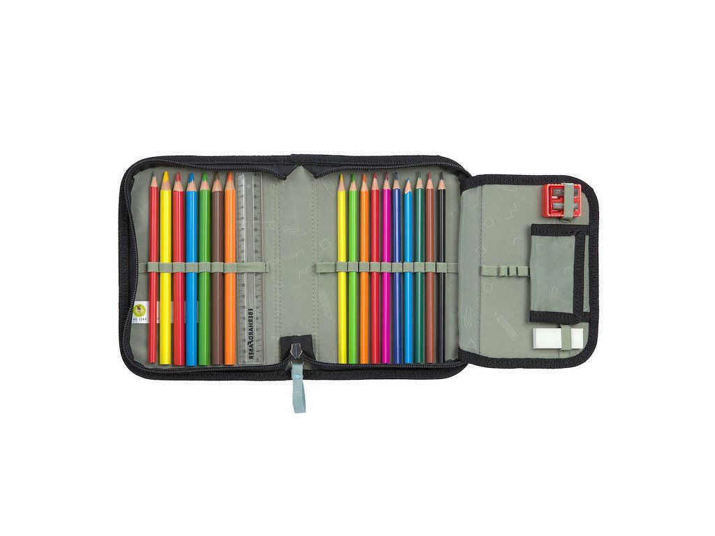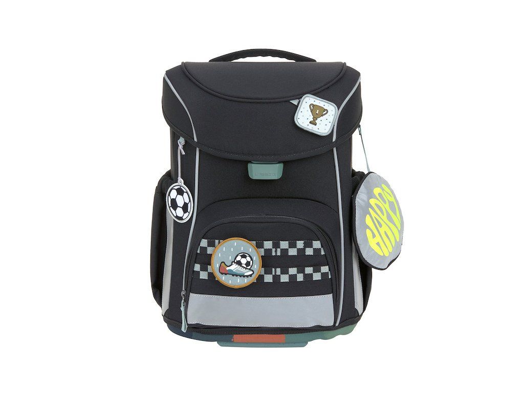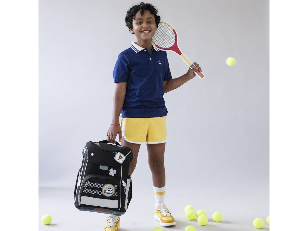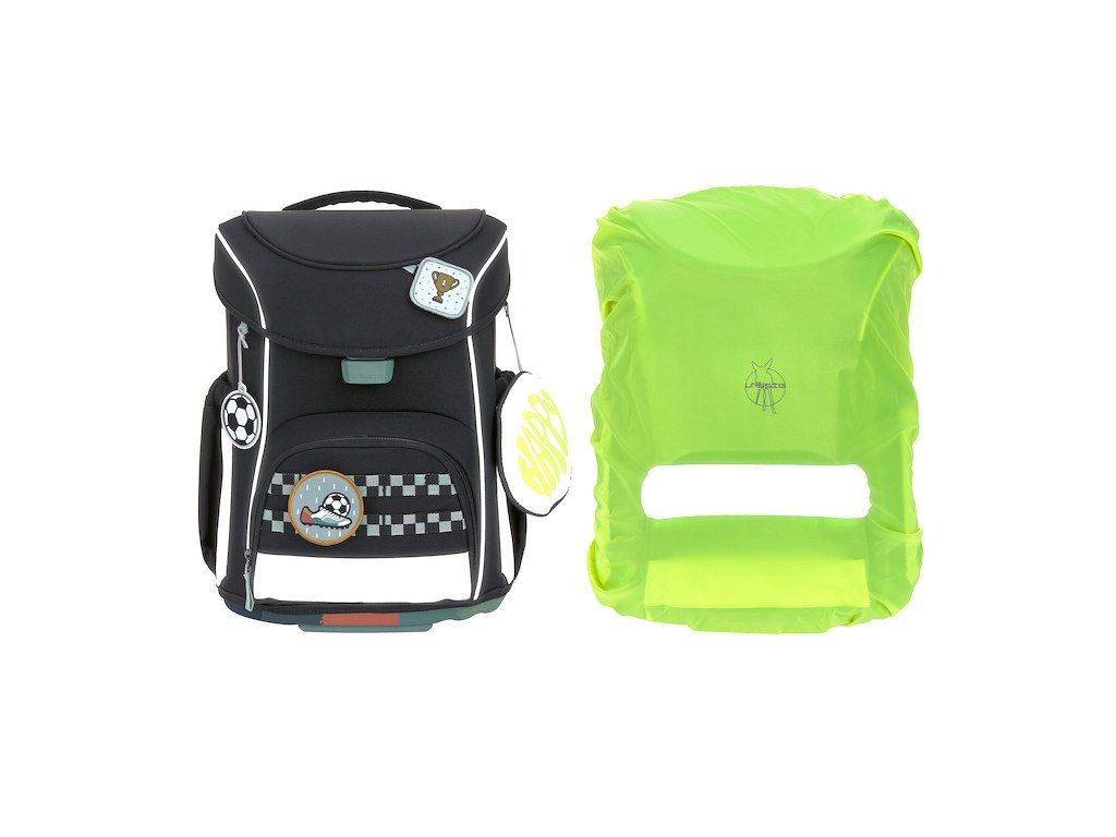 Praktický sedmidílný školní set obsahuje: školní batoh, sportovní vak, velký vybavený penál, kapsičku na krk, malý penál se zipem, pláštěnku a sadu skládající se z přívěsku a 2 nášivek určených k ozdobení setu.
