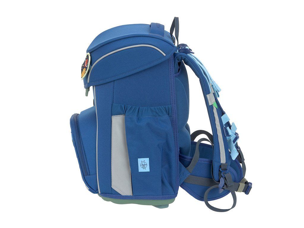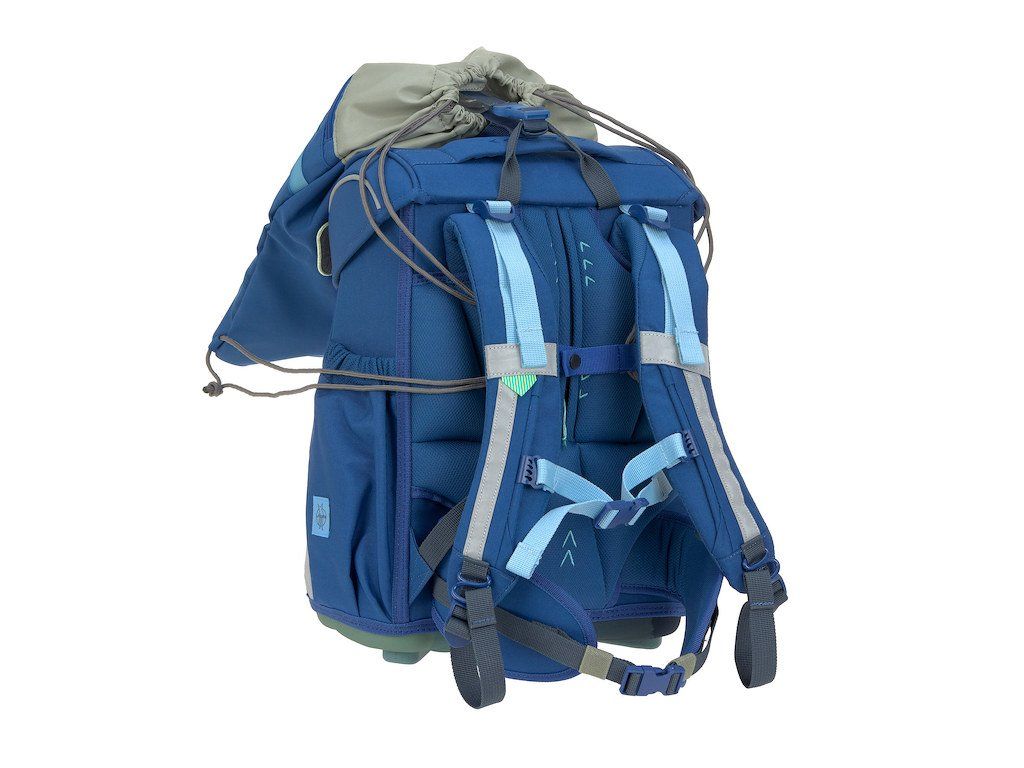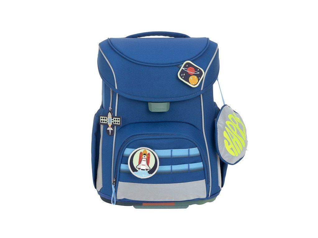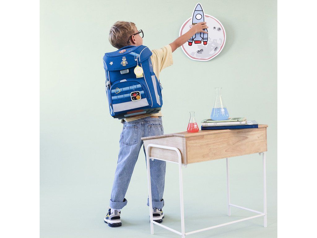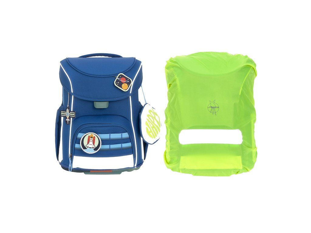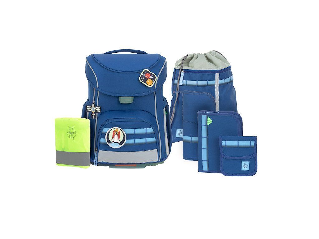 Praktický sedmidílný školní set obsahuje: školní batoh, sportovní vak, velký vybavený penál, kapsičku na krk, malý penál se zipem, pláštěnku a sadu skládající se z přívěsku a 2 nášivek určených k ozdobení setu.