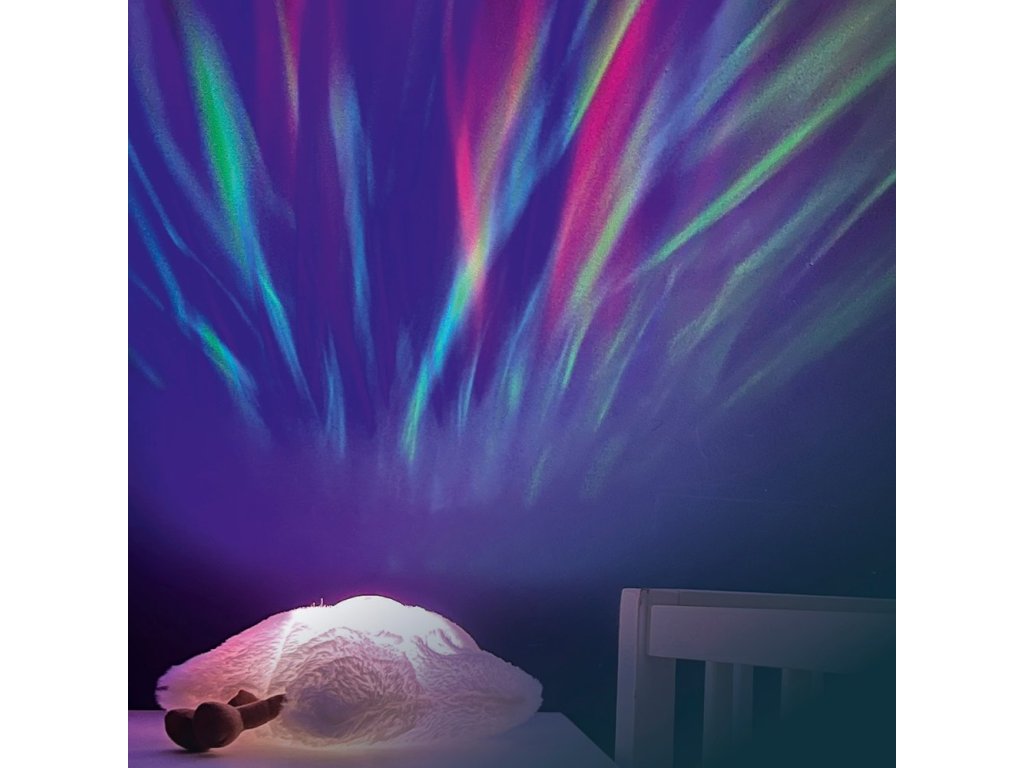 Projekce polární záře obklopí dítě magickým světelným světem.
