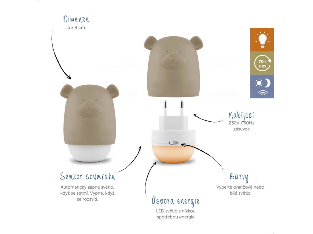 Medvídek BENNY je přenosné dobíjecí dětské noční světlo, které se automaticky zapne, když se setmí, a vypne, když se rozední.