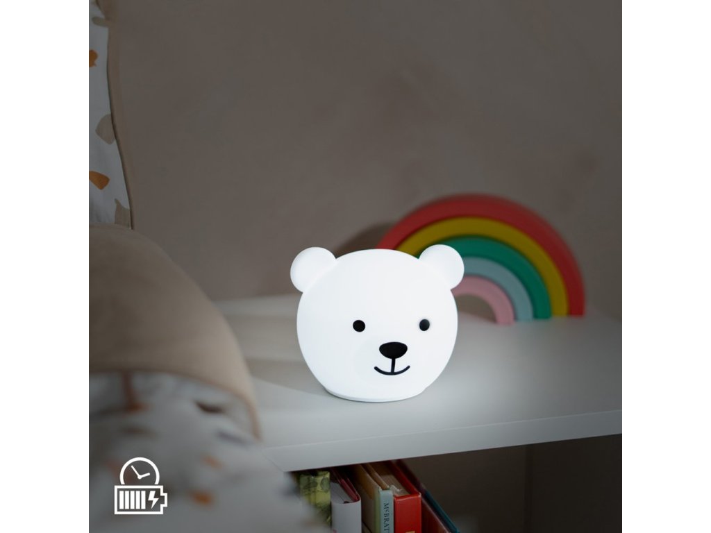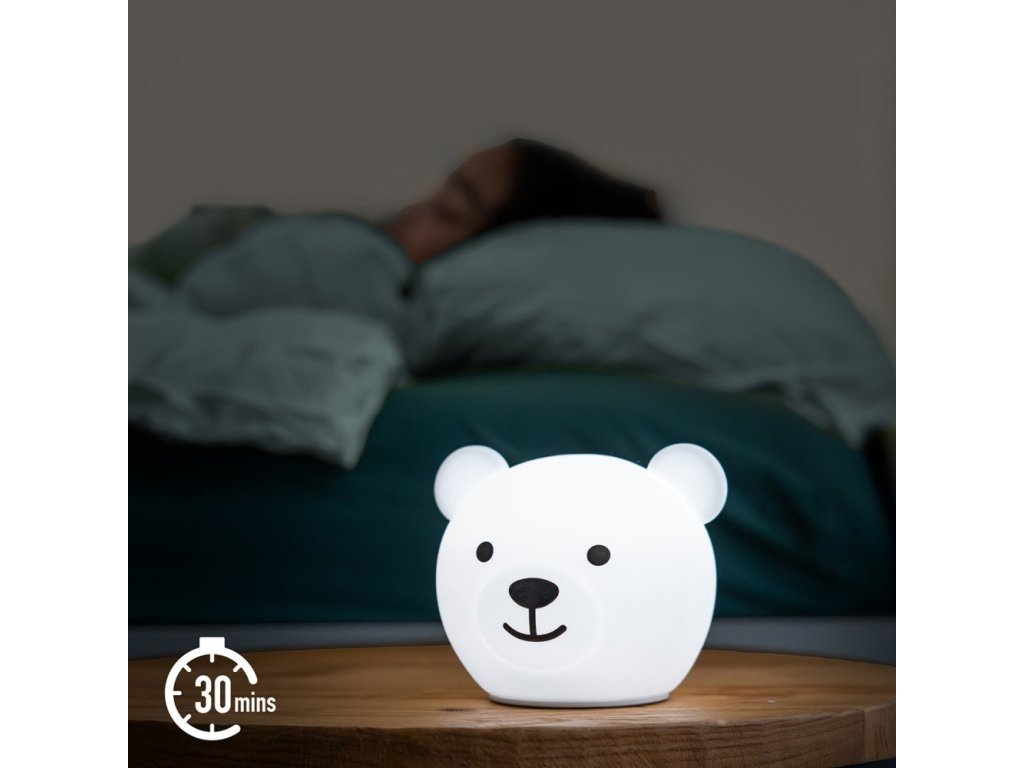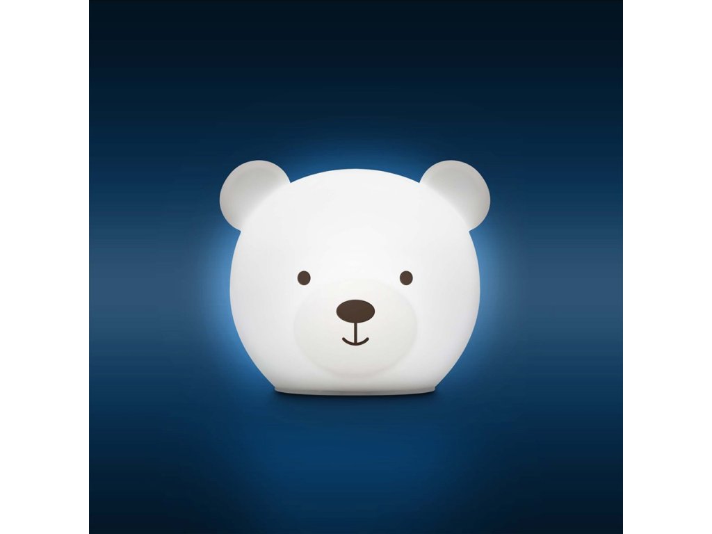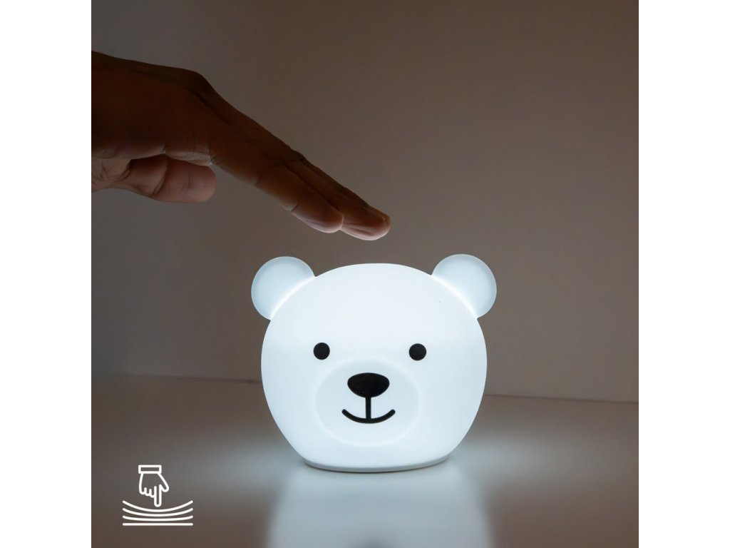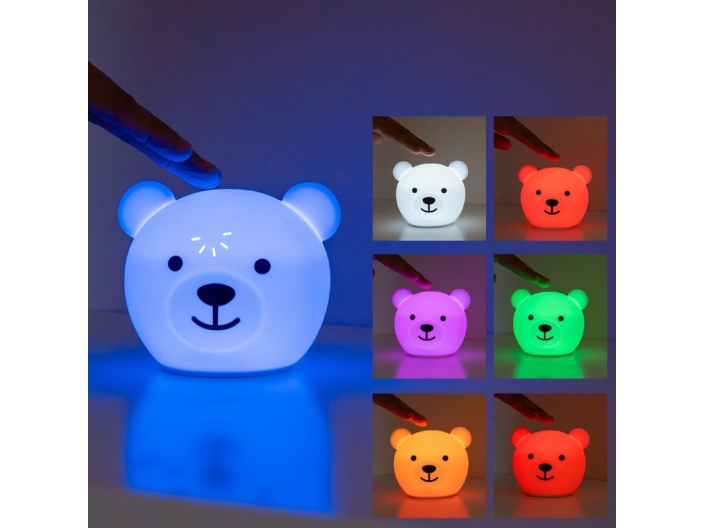 Pouhým poklepem na medvíka je možné měnit barvu nočního světla. Můžete si vybrat červené, oranžové, žluté, zelené, modré, růžové, bílé a vícebarevné světlo.
