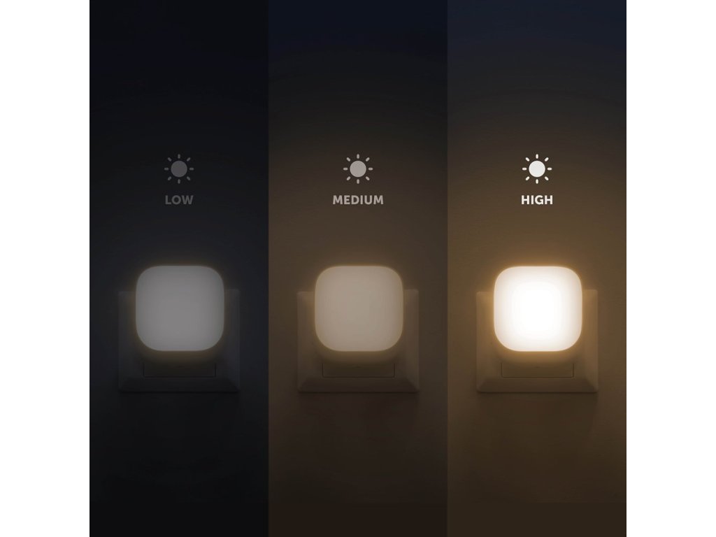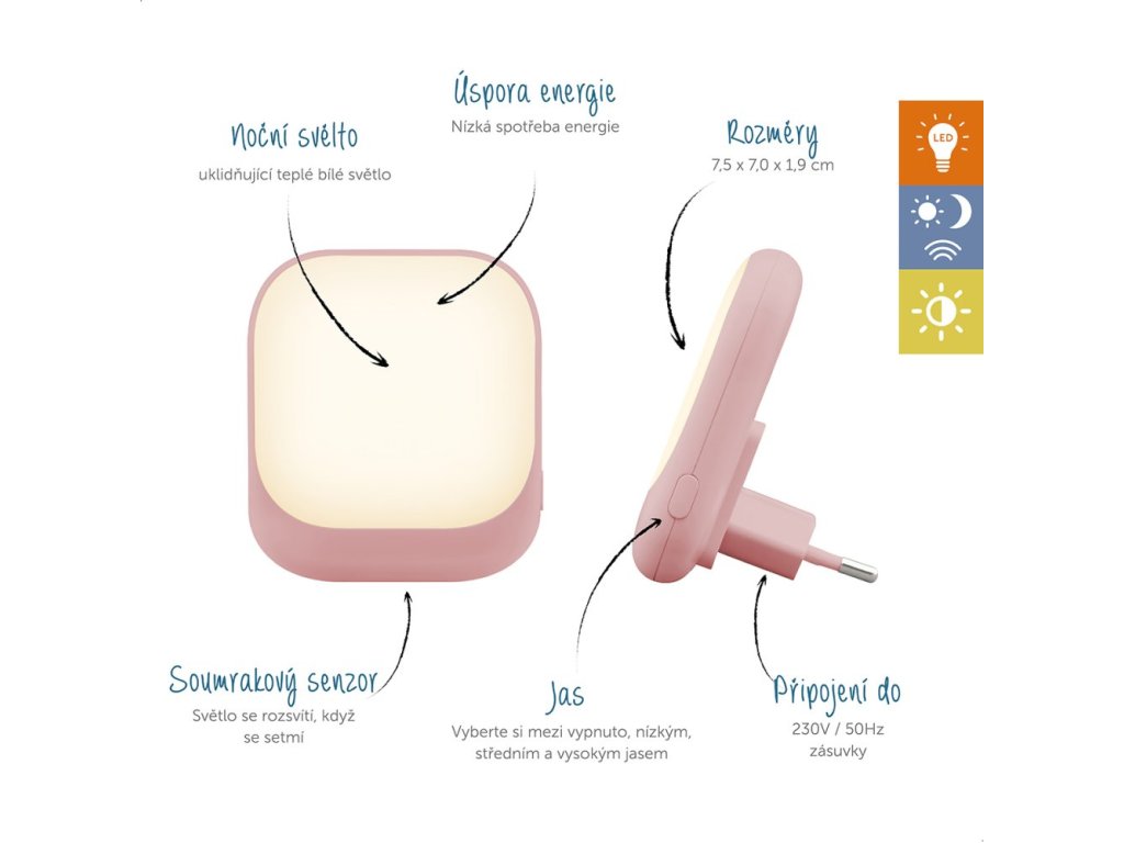 Díky jemnému a tlumenému světlu usnadňuje orientaci v noci, například při cestě na toaletu, a pomáhá překonávat strach ze tmy. Vestavěný senzor soumraku automaticky zapíná světlo při setmění a ráno jej opět vypíná – bez nutnosti manuálního ovládání.