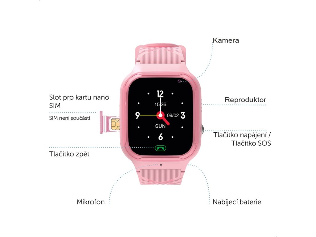 - SOS funkce – dítě může jediným stiskem tlačítka okamžitě kontaktovat přednastavená nouzová čísla.