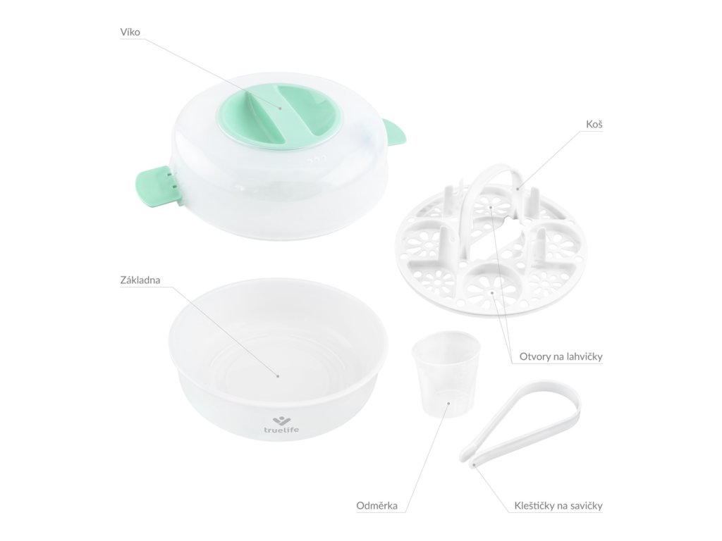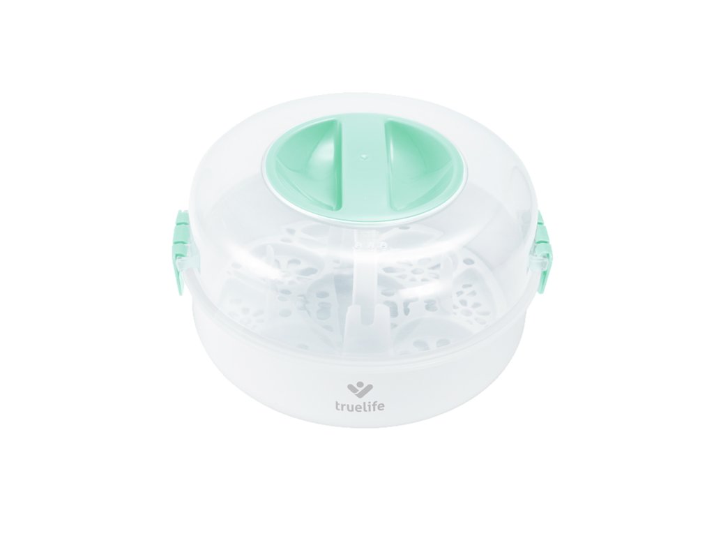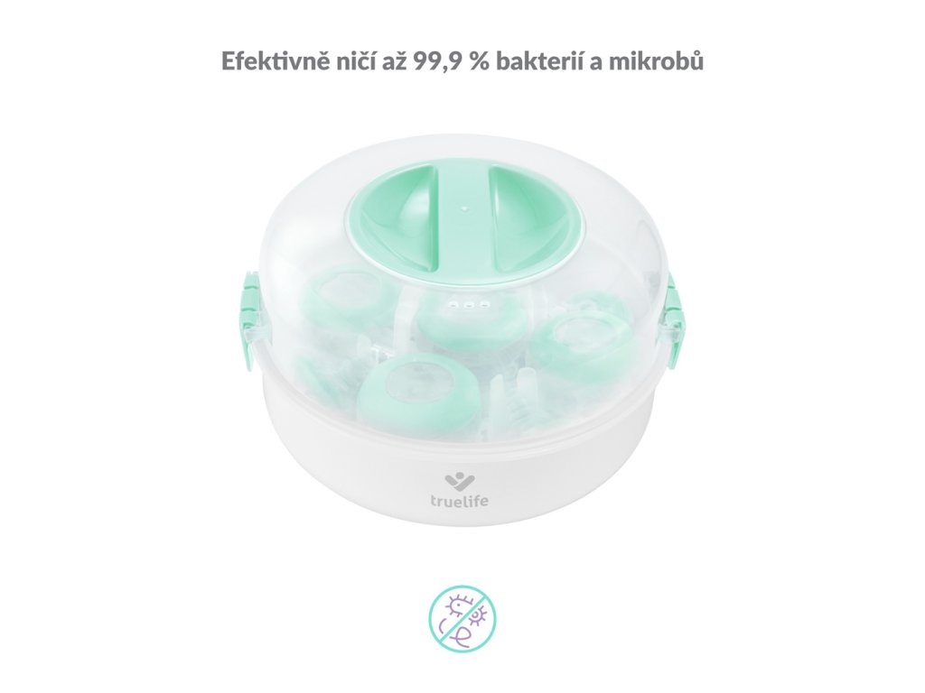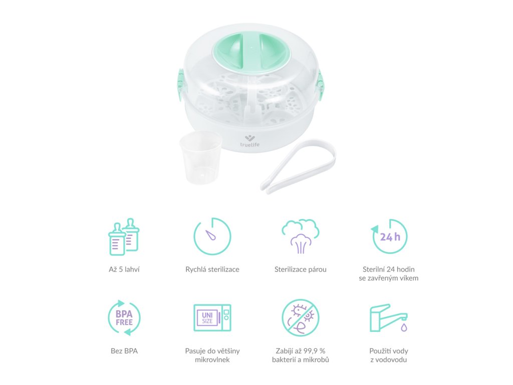 Ochrana imunitního systému vašeho dítěte pro vás nemusí znamenat neustálé vyvařování lahviček a dudlíků. Se sterilizátorem do mikrovlnné trouby TrueLife Invio MS5 sterilizujete dětské lahvičky, kousátka a další předměty během dvou minut. K tomu potřebujete jen obyčejnou vodu a mikrovlnnou troubu. Sterilizátor využívá nemocniční metodu parní sterilizace, která je rychlá, účinná a bez chemických látek. Ničí tak 99,9 % bakterií a mikrobů, které se na dětských předmětech nacházejí, aniž by poškodil jejich povrch. Sterilizátor je navržen pro většinu mikrovlnných trub na trhu a zvládne většinu typů kojeneckých lahví. Pojme až 5 lahviček naráz a snadno se ovládá. Díky kompaktním rozměrům s ním můžete bez problému cestovat.