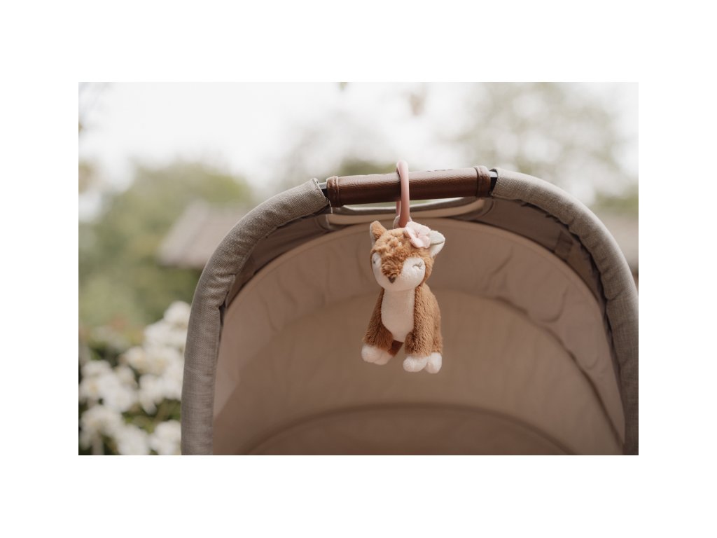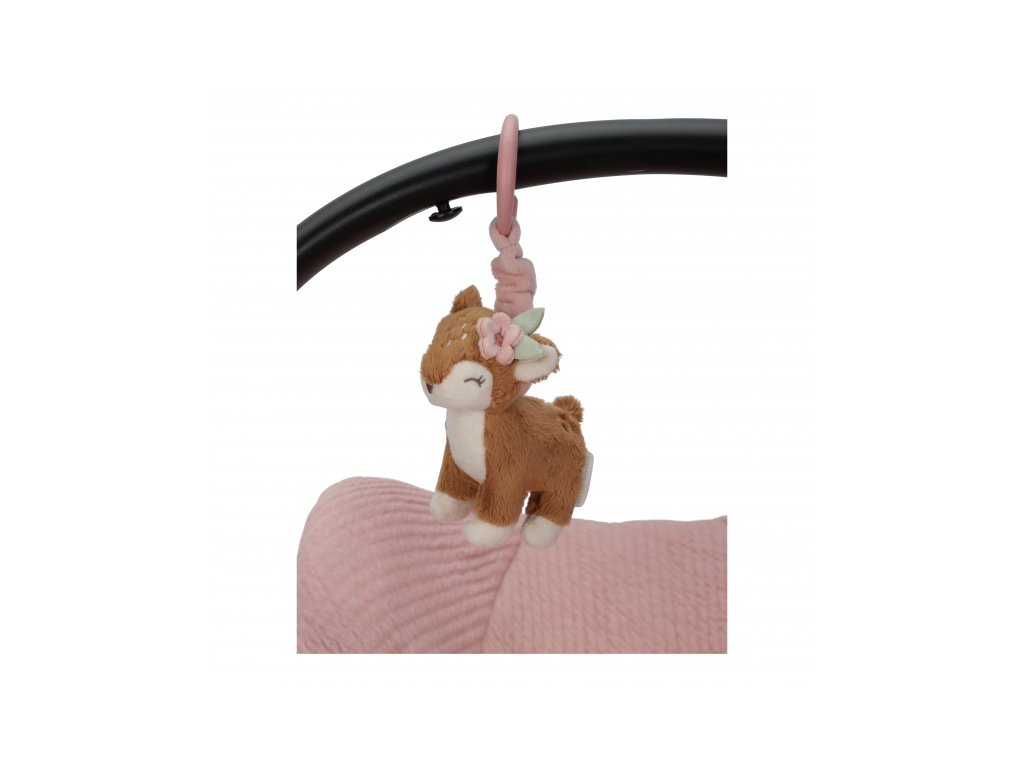 Plyšová srnka po zatažení za šňůrku vibruje a legračně poskakuje. Hračku je možné snadno zavěsit na autosedačku, kočárek či hrazdu na hrací dece.