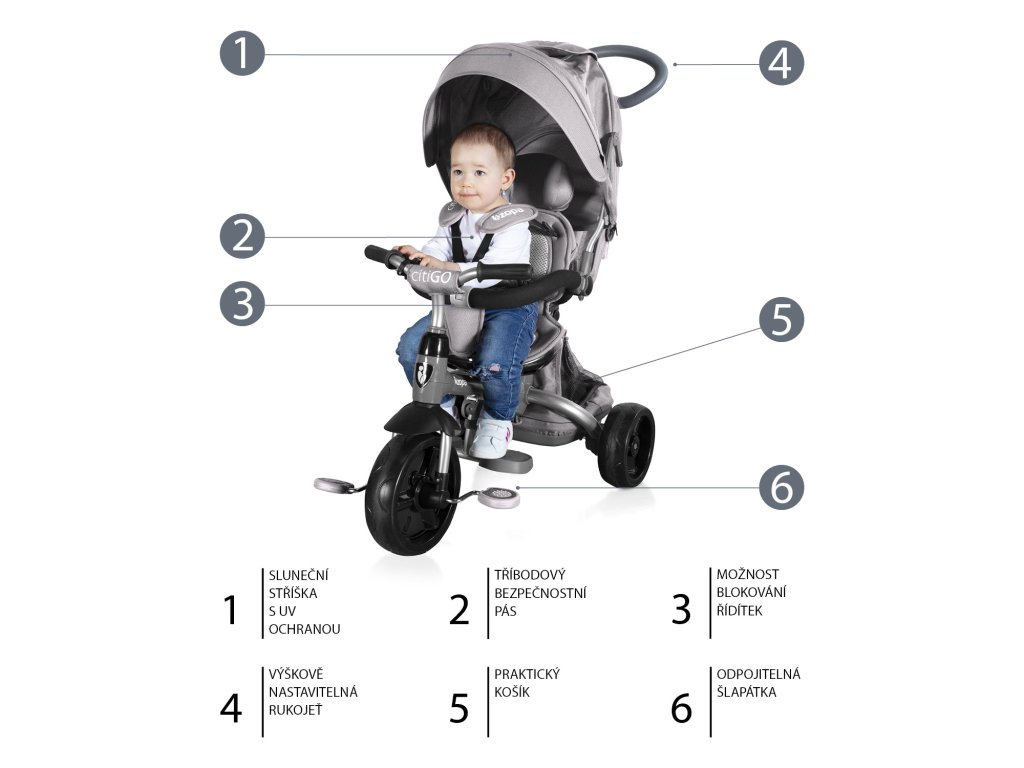 - Demontáž sluneční stříšky, hrazdy, přední opěrky a pedálů umožní dítěti lepší požitek z jízdy.