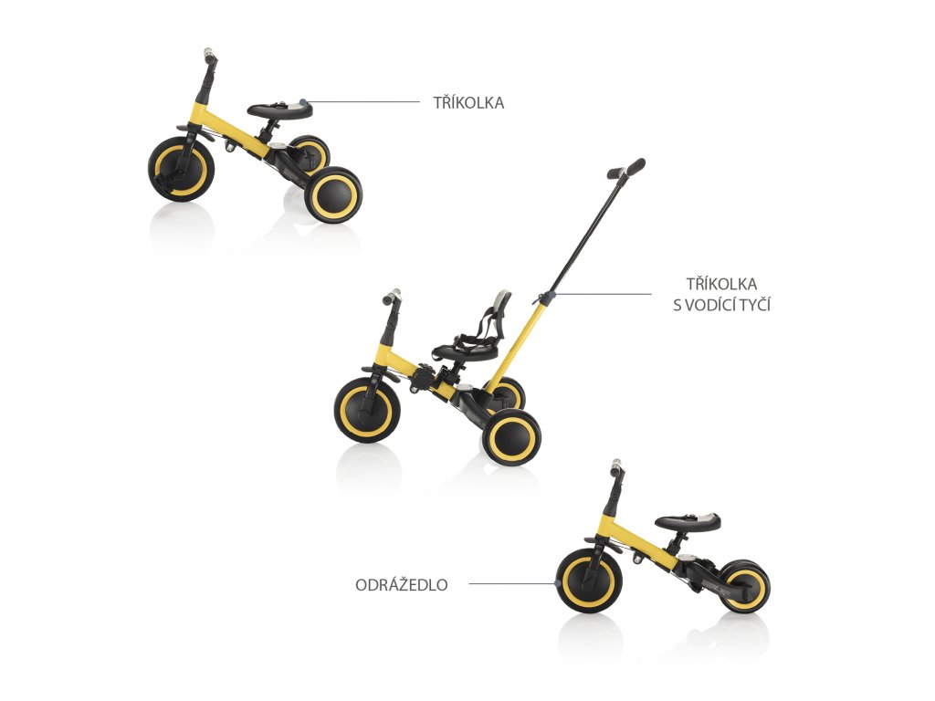 Tříkolka má možnost volby používání s vodicí tyčí či bez vodící tyče. Variantu s