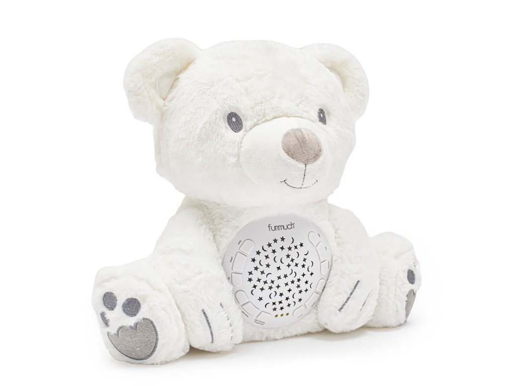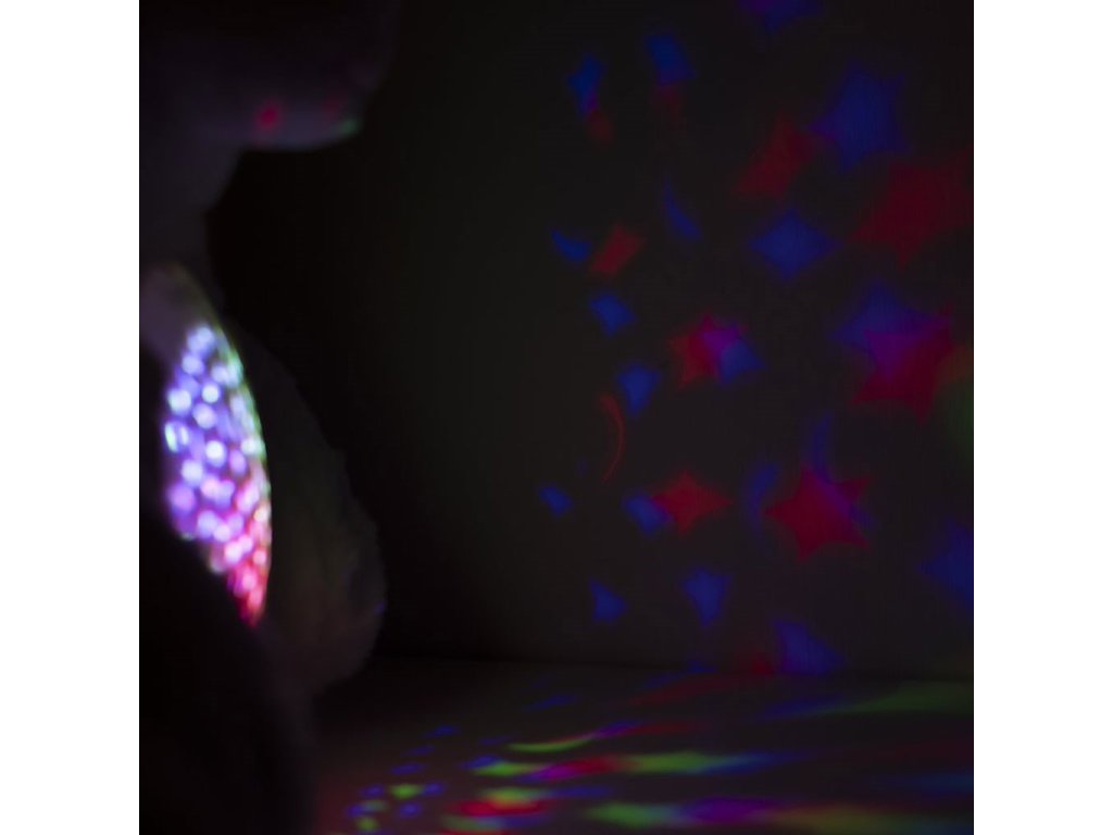 Plyšáček s projektorem je úžásným pomocníkem při uspávání dětí. Jeho design je měkký a pohodlný, ideální pro malé děti. Usínáček je vyroben z měkkého a příjemného plyšového materiálu. Plyšáček je vybaven projekčním zařízením, které na stěnu nebo strop promítá krásné barevné hvězdičky a měsíc. Usínáček má také funkci bílého šumu, která produkuje klidný šum, podobný šumu vln, deště nebo tichého větru a vytváří relaxační zvukový podklad pro uspávání dítěte. Kromě bílého šumu může usínáček přehrávat klidnou a jemnou hudba, která může být volitelně zapnuta nebo vypnuta podle preference. Baterie vložíte do plyšáčka pomocí vyjmutí bříška.